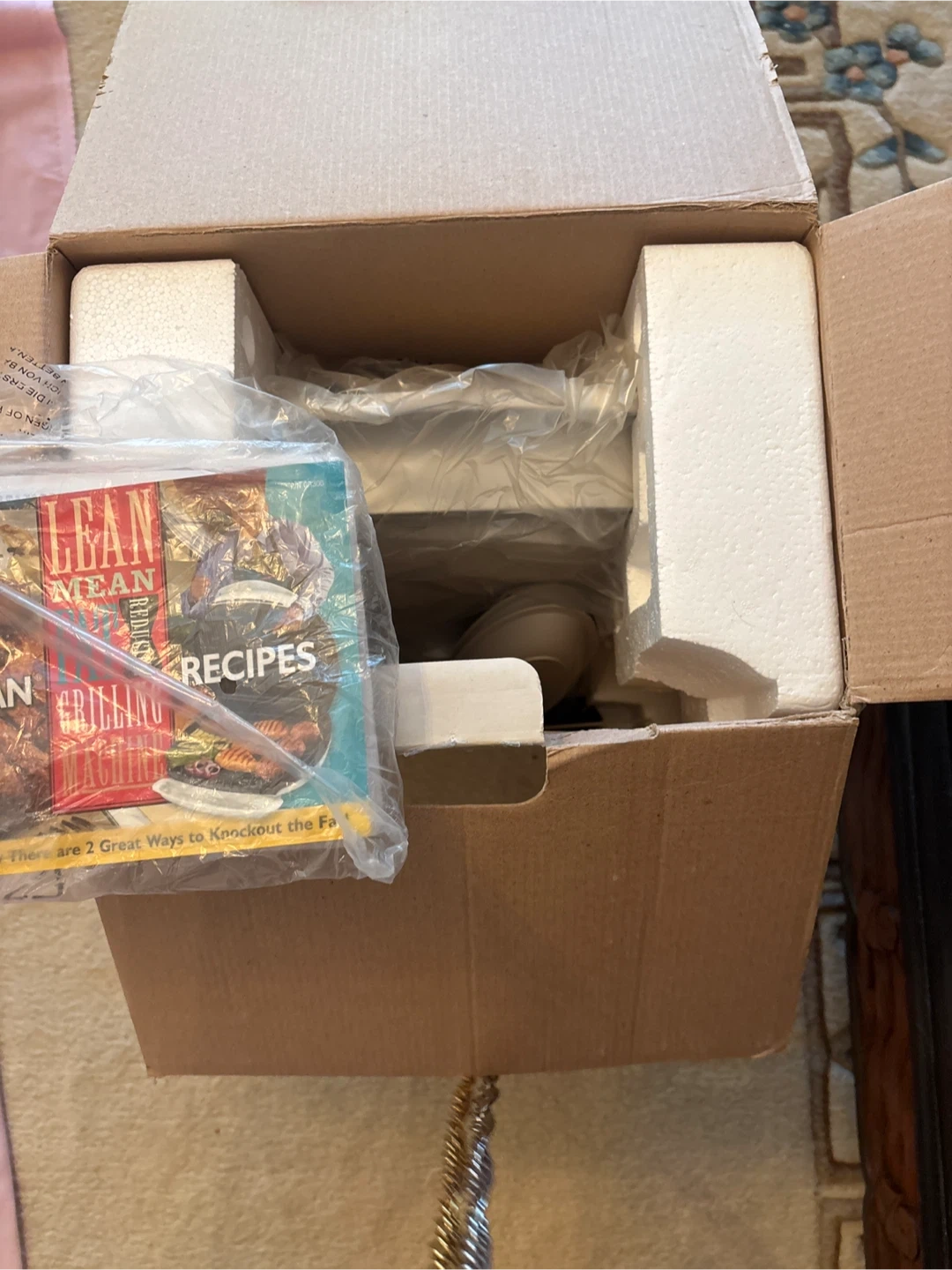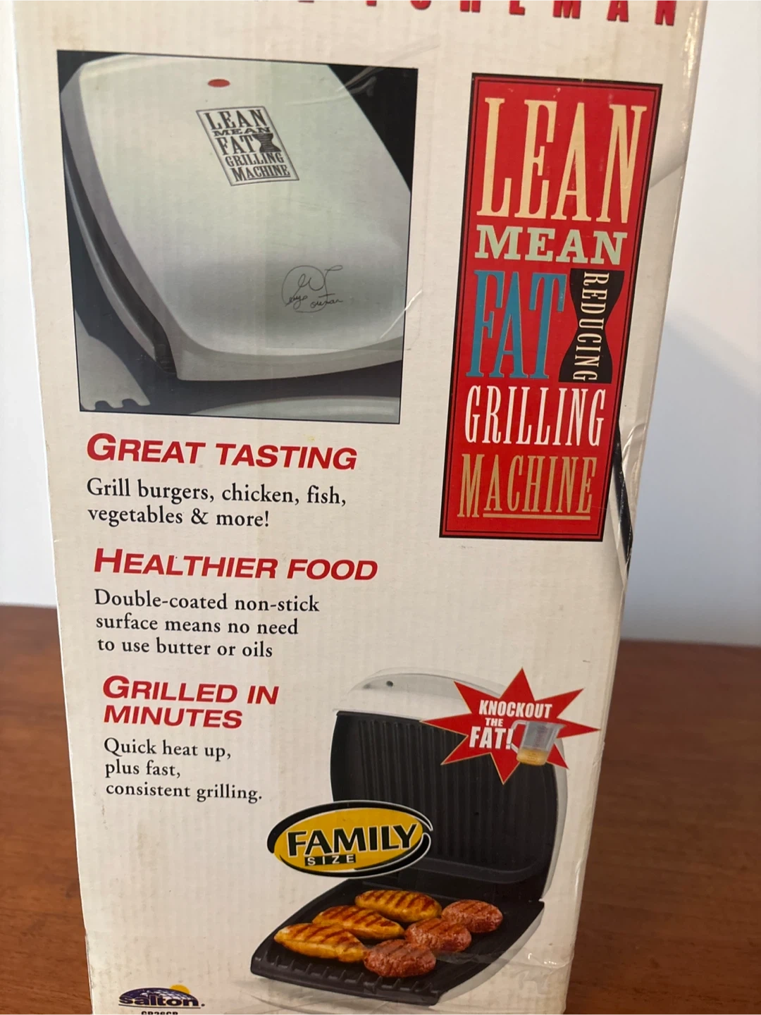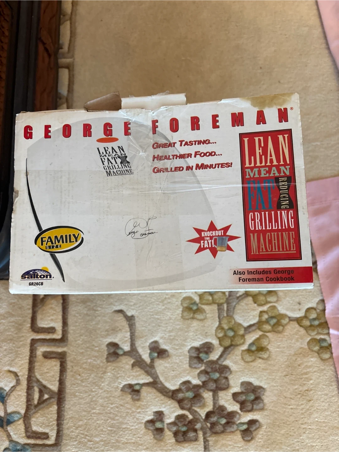 Selling a new George Foreman Lean Mean Fat Reducing Grilling Machine! It's versatile and easy to use, perfect for grilling food fast and evenly. The patented sloped grill design keeps food above grease, fat, and excess liquids. Comes with the original box and a recipe book for great grilling and roasting