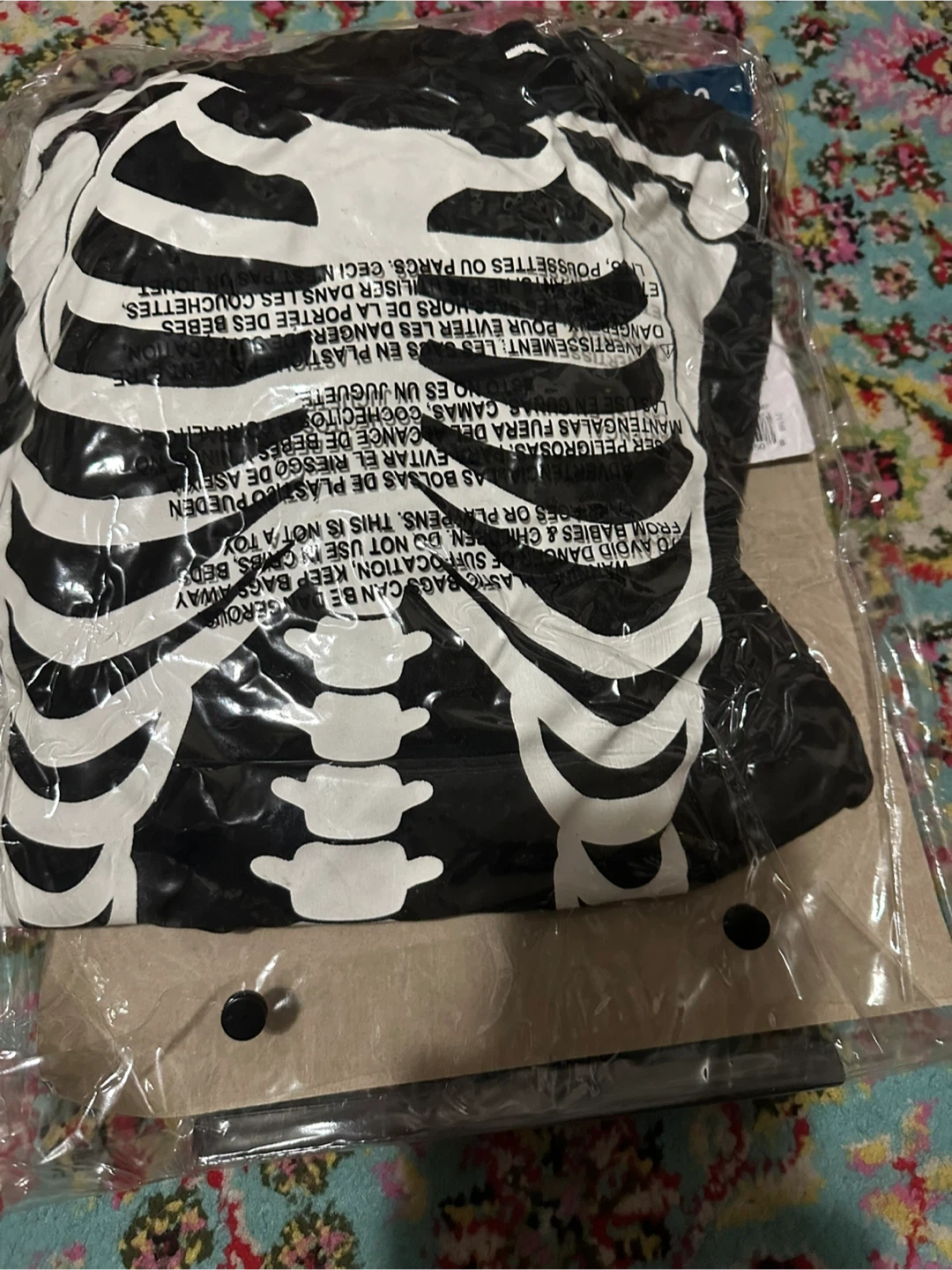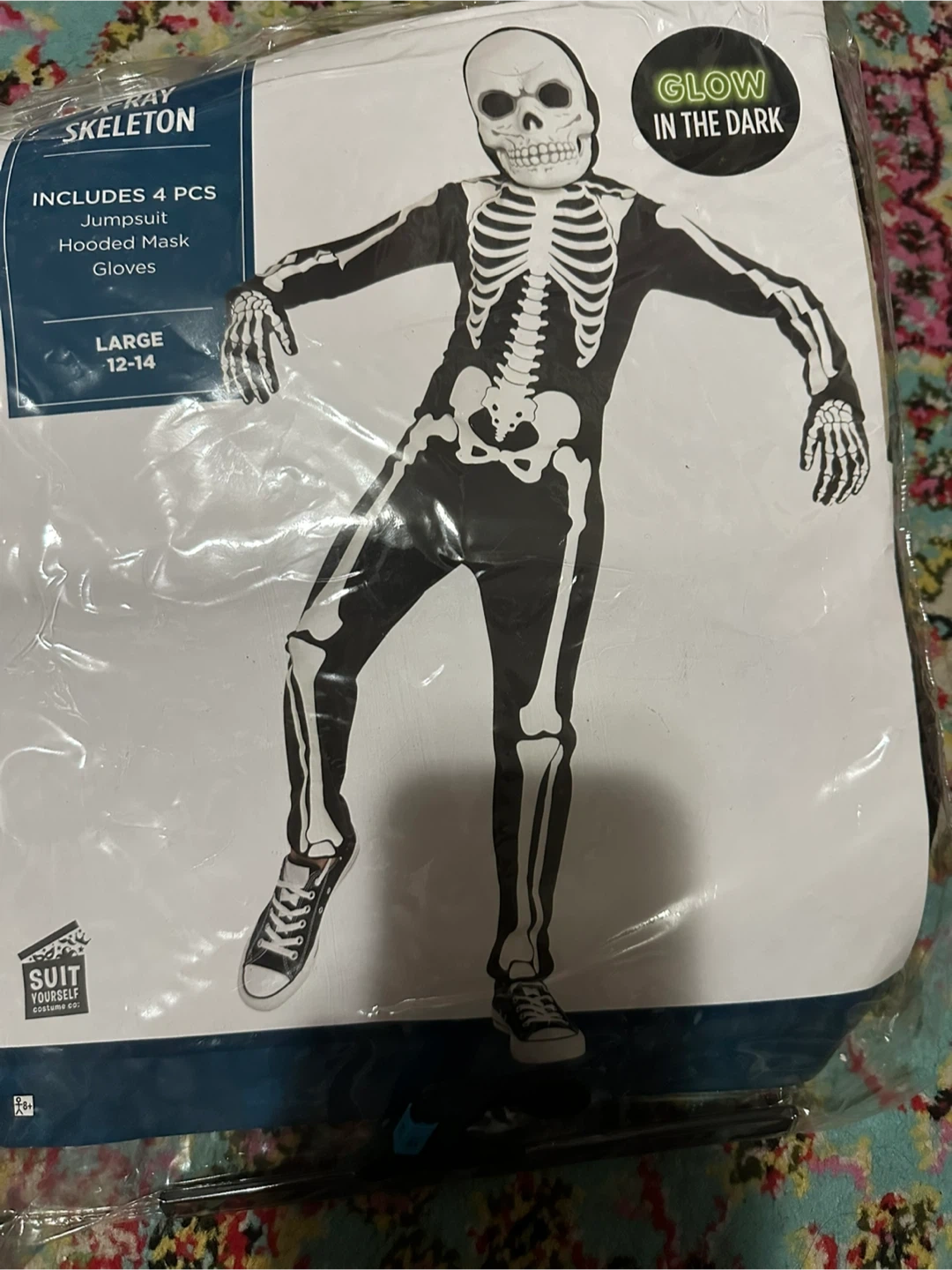 Selling a brand new Gray Skeleton costume, size Large (12-14)! This costume includes 4 pieces: a jumpsuit, hooded mask, and gloves. It even glows in the dark!