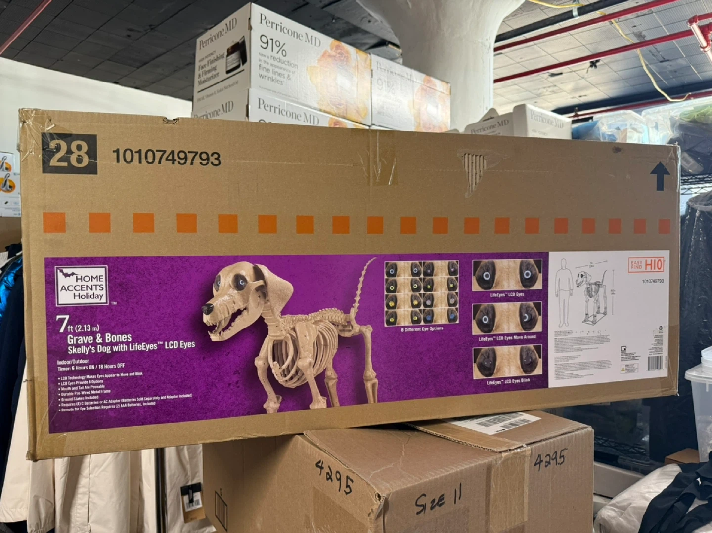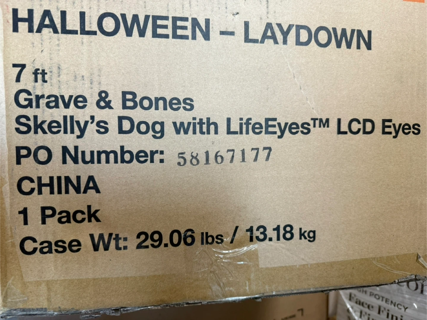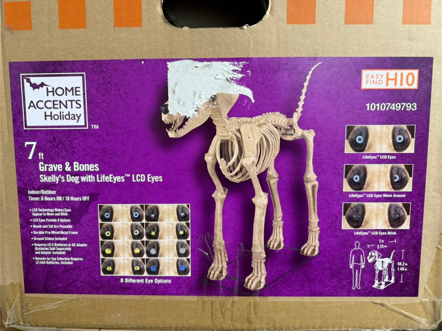 Selling a BRAND NEW SEALED Home Accents Holiday 7 ft Grave & Bones Skelly's Dog with LifeEyes LCD Eyes Halloween decoration Indoor/Outdoor Timer: 8 Hours ON / 18 Hours OFF - LCD Technology Makes Eyes Appear Real - LCD Eyes Provide 8 Options - Mouth and Tail Are Poseable - Durable Pre-Wired Metal Frame - Ground Stakes Included