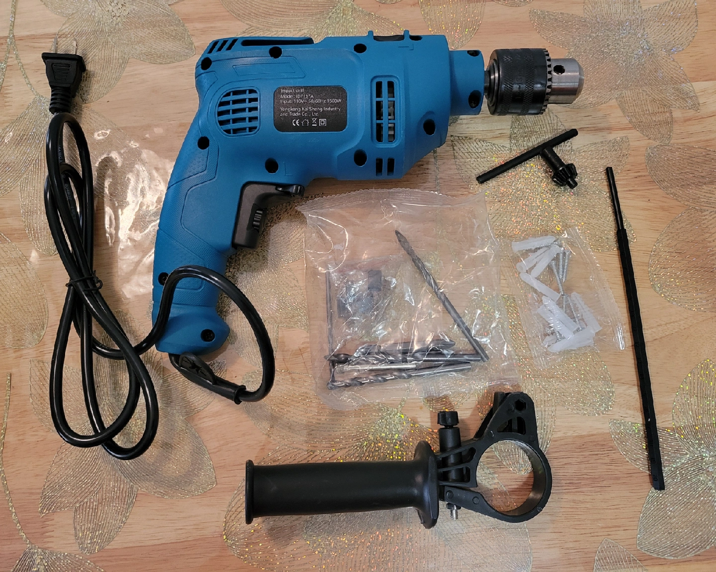92Selling an Impact Drill model ID7137A. It operates at 110V ~ 50/60Hz, 1500W. Included are various drill bits, screws, lock key and attachments as pictured.