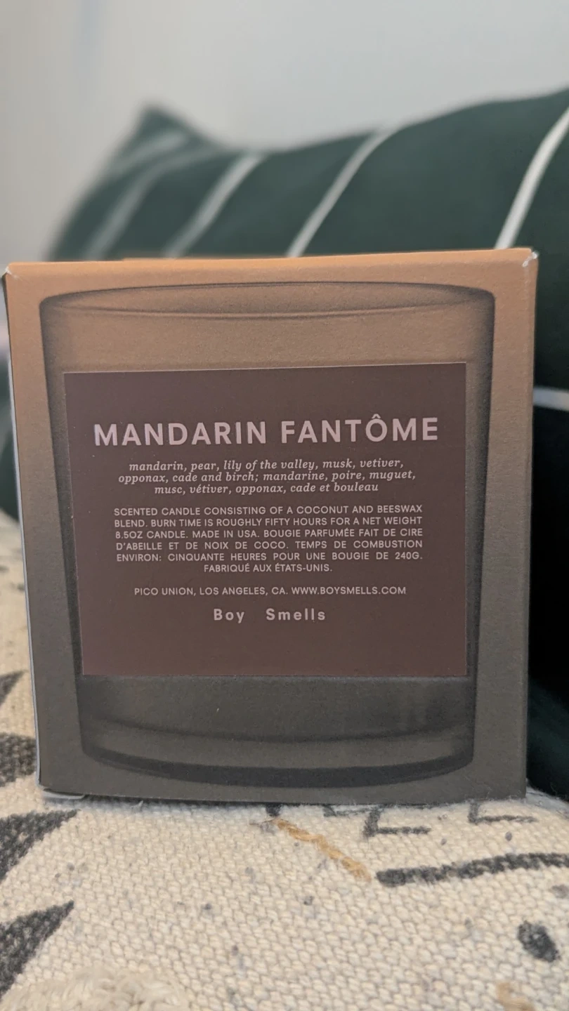 202Selling a Boy Smells Mandarin Fantôme scented candle. It's a scented candle consisting of a coconut and beeswax blend. The candle has a net weight of 8.5oz or 240g. The box is included!