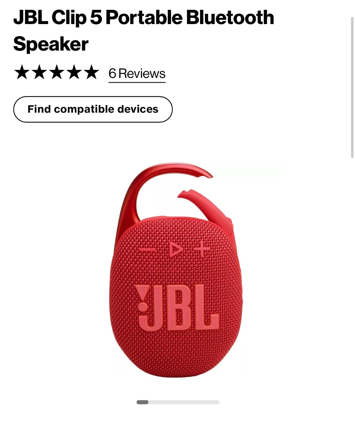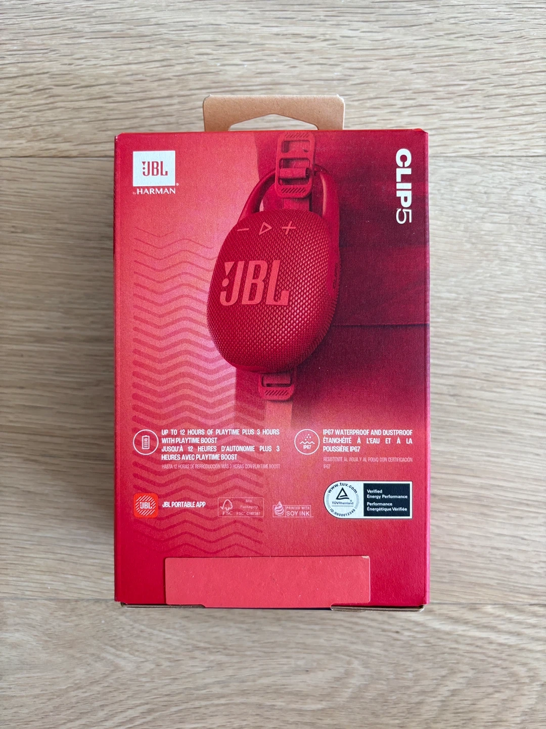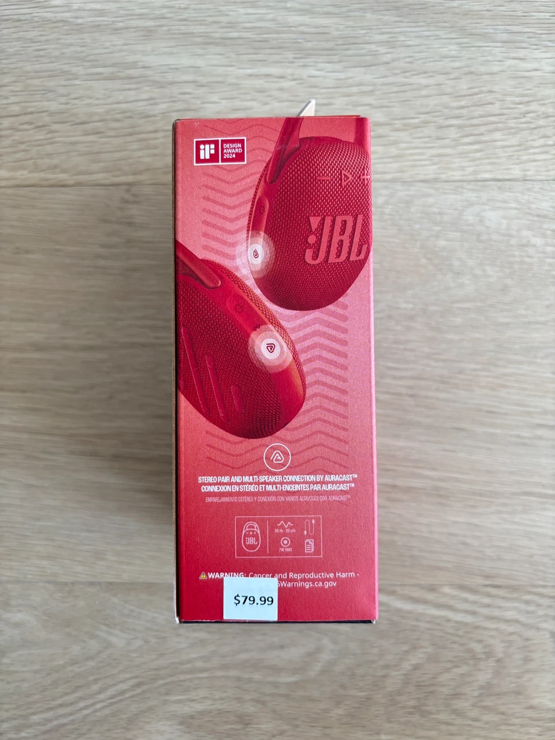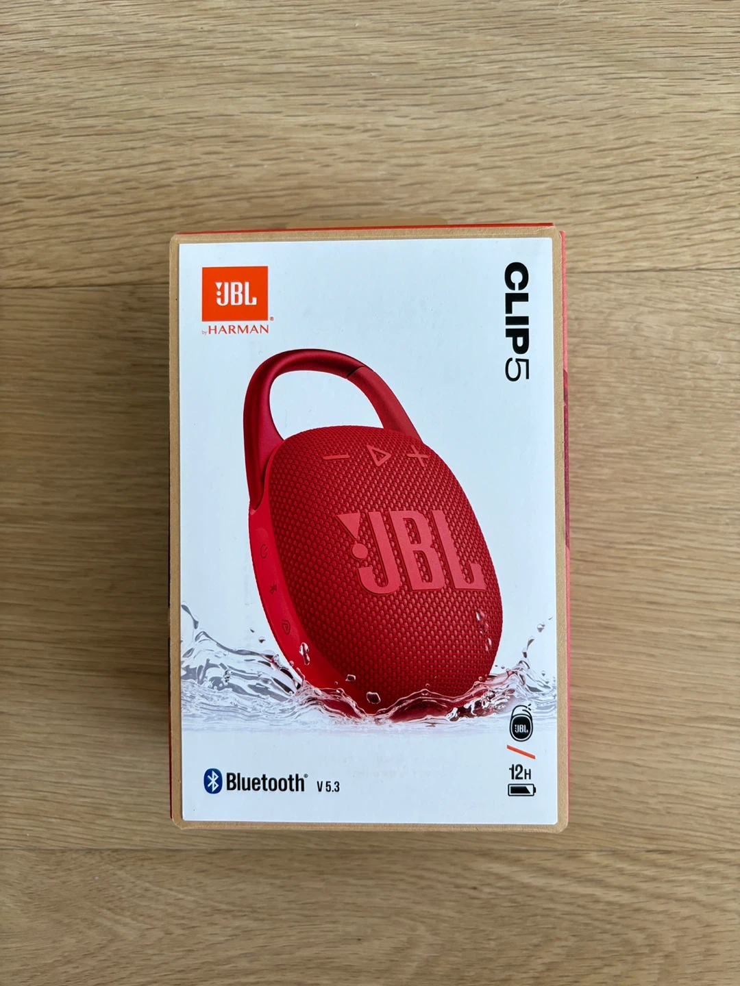 Selling a brand new JBL Clip 5 portable Bluetooth speaker in red! It's still in its original packaging. Key features: - Bluetooth V5.3 - Up to 12 hours of playtime + 3 hours with Playtime Boost - IP67 waterproof and dustproof - Stereo pair and multi-speaker connection by Auracast Originally retails for $79.99
