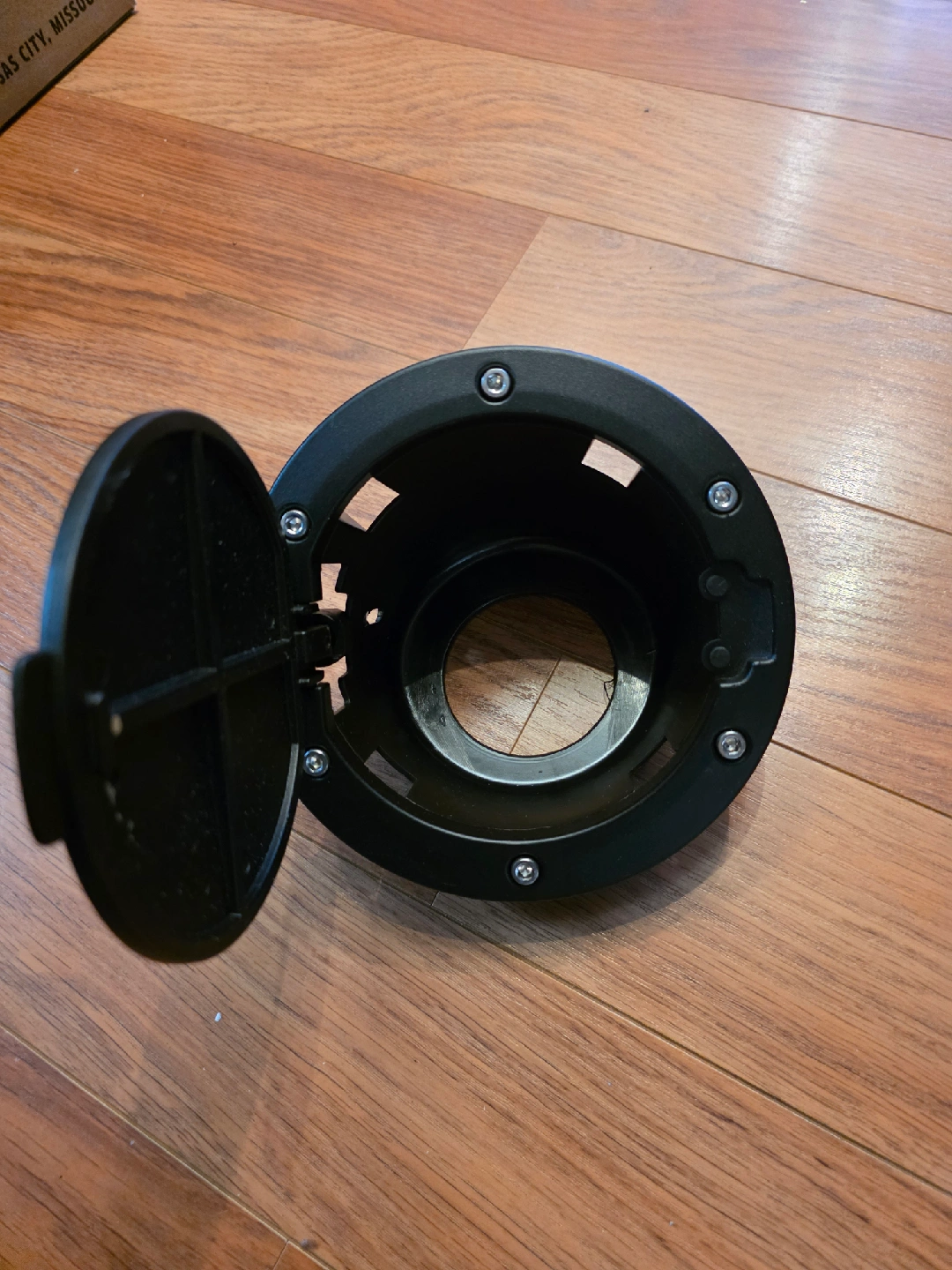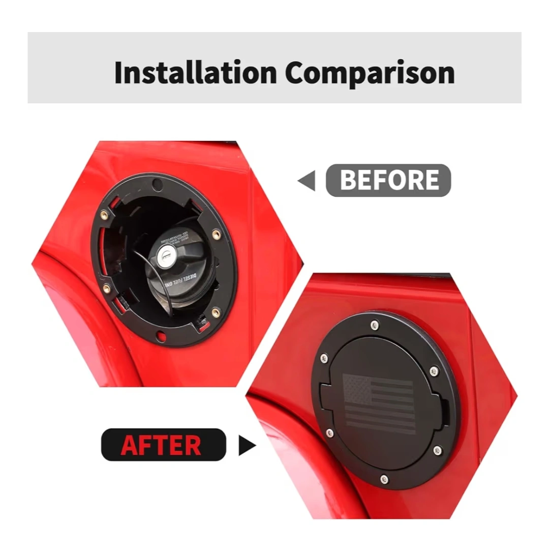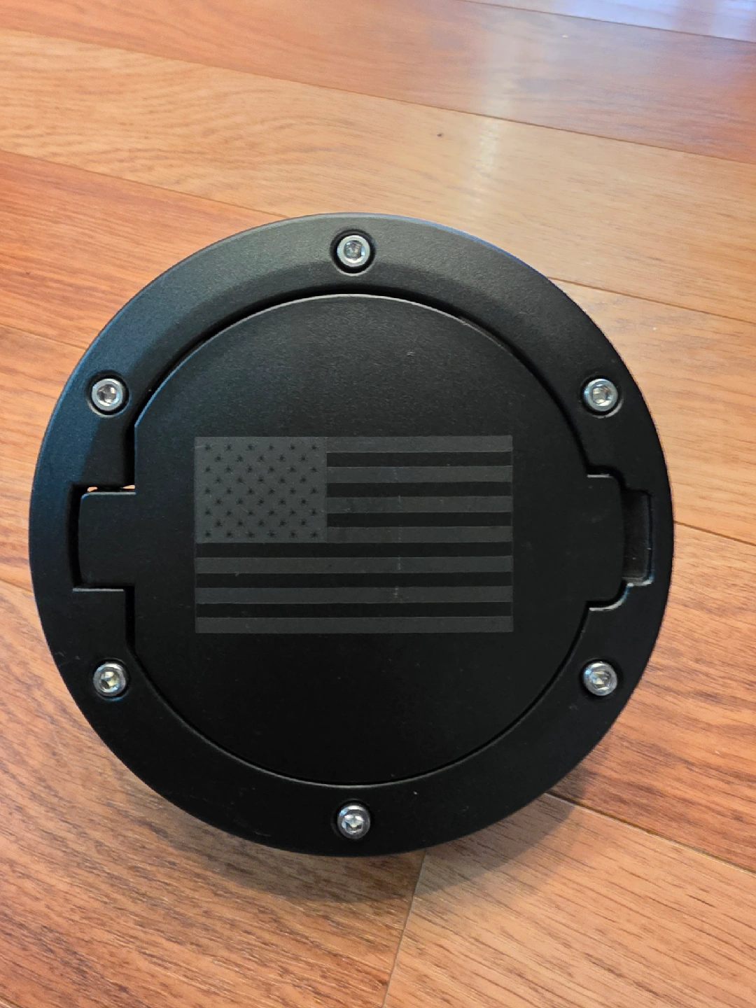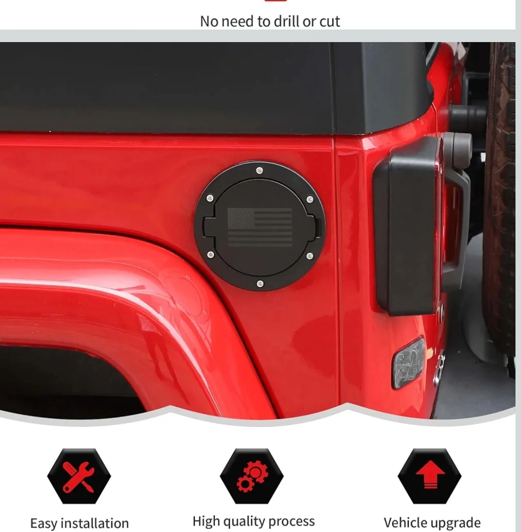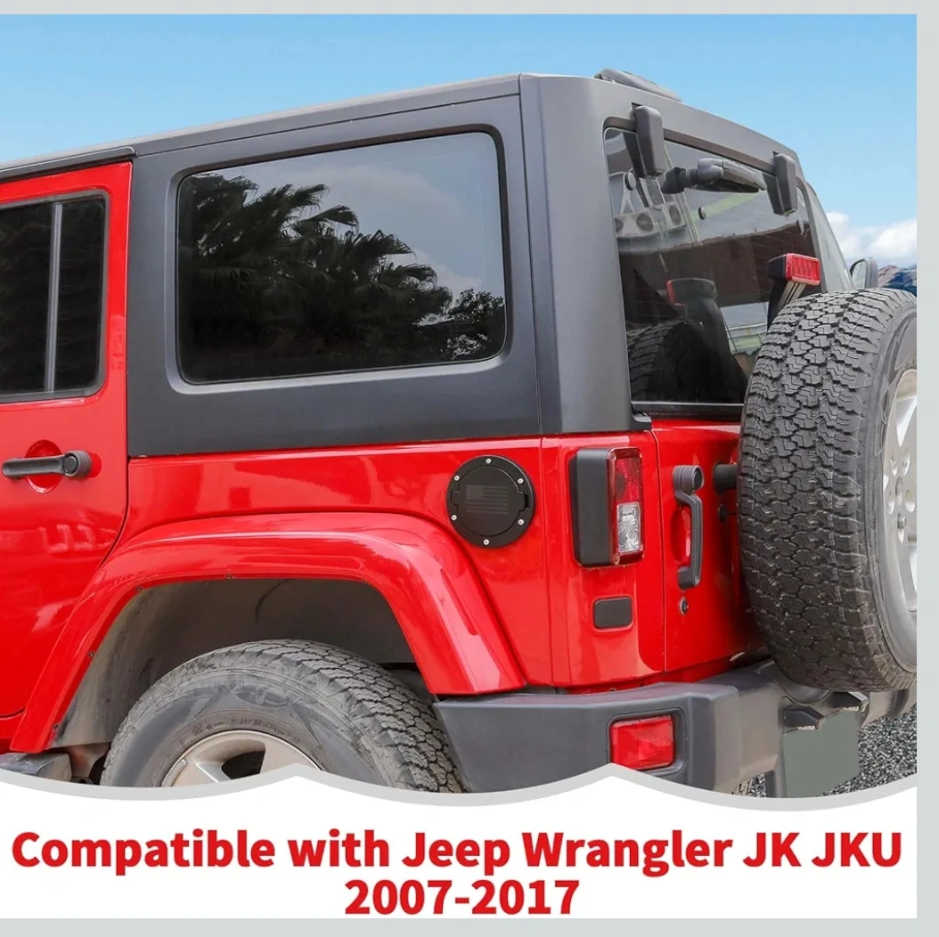 15This is a black fuel gas tank door cover for a Jeep Wrangler JK It has an American flag design on the door. It's in great condition and ready to install!