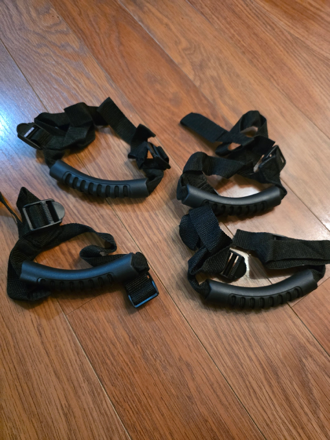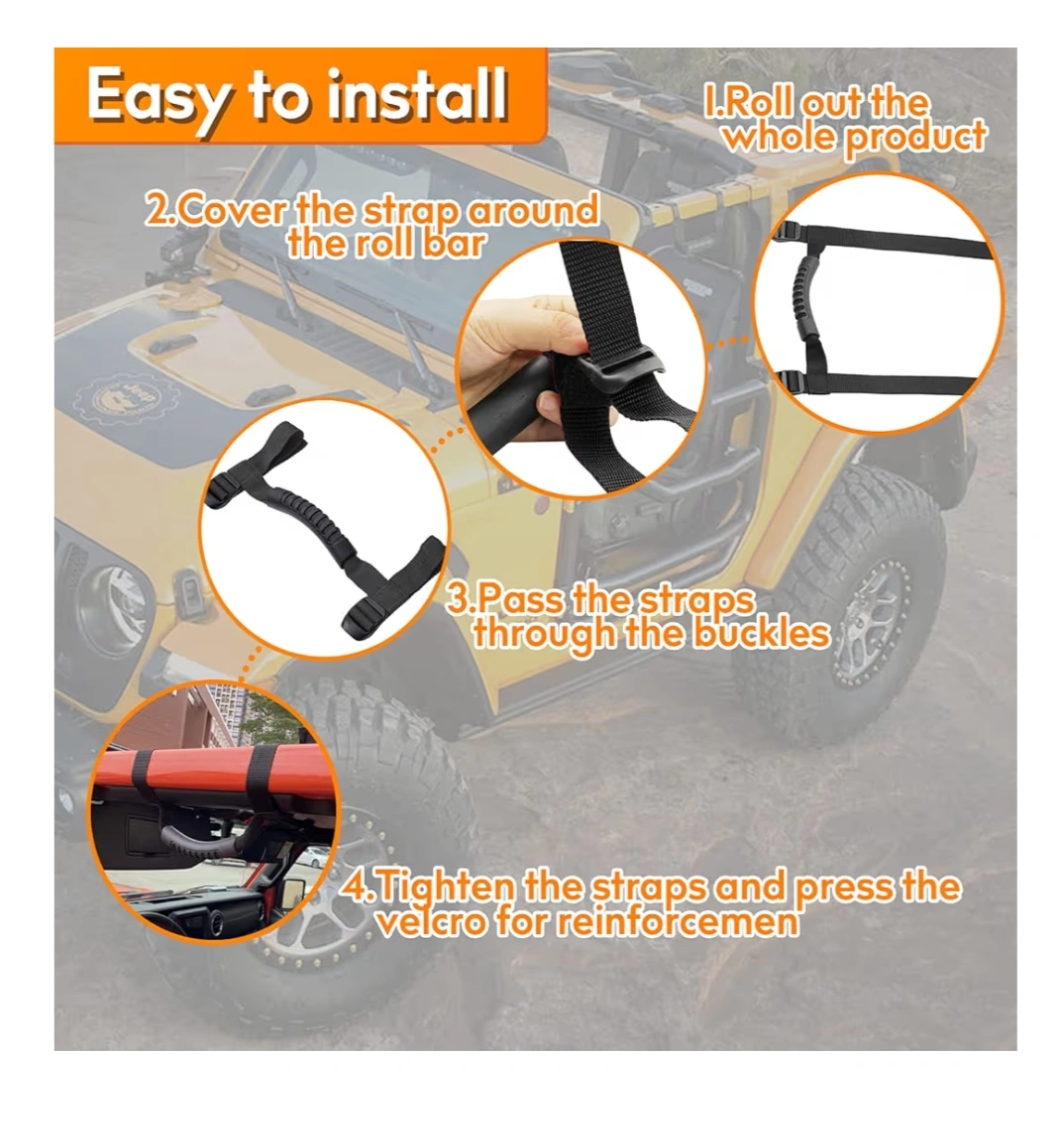 BRAND NEW, selling a set of 4 grab handles for a Jeep Wrangler. These are easy to install and suitable for all models of Jeep Wrangler. They attach to the roll bar with straps and buckles, providing extra support when you're off-roading!