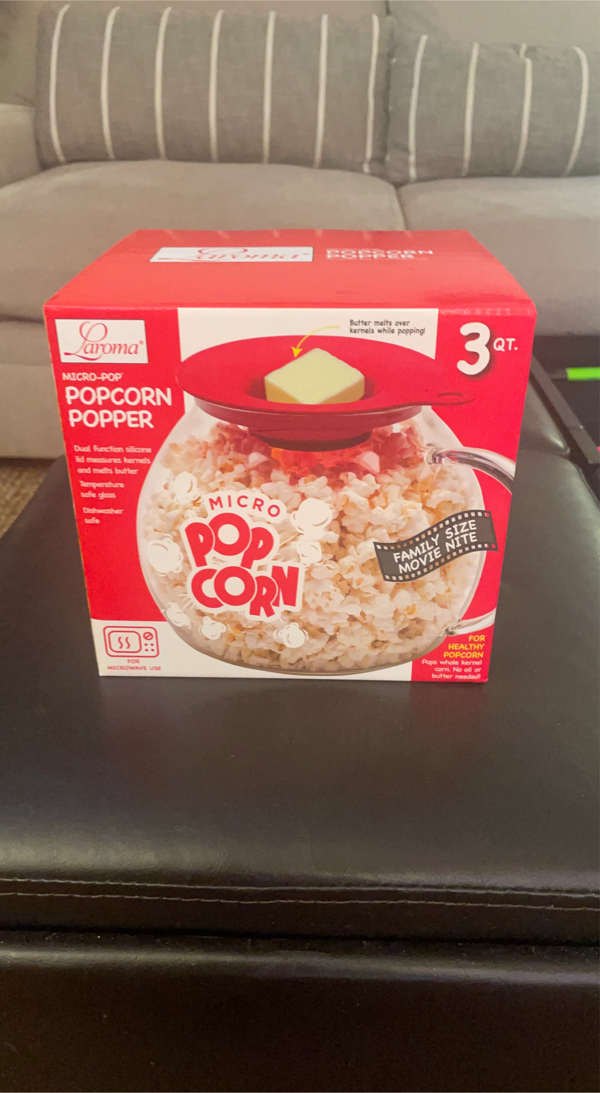 I'm selling a brand new Laroma Micro-Pop Popcorn Popper! It's a 3-quart popper that's perfect for making popcorn in the microwave. It includes the original box, bubble wrap and instructions. It’s ready for a new home.
