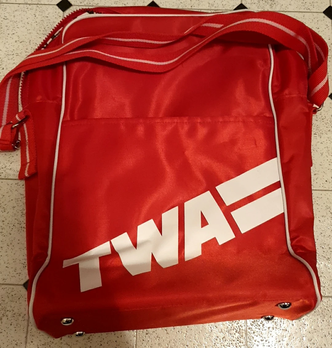 Red flight bag. Features white TWA logo. Shoulder strap. Zipper closure. Limited Item for Collectors! Never used! Like Brand New! Originally: 85$ Now: 40$ -> 30$