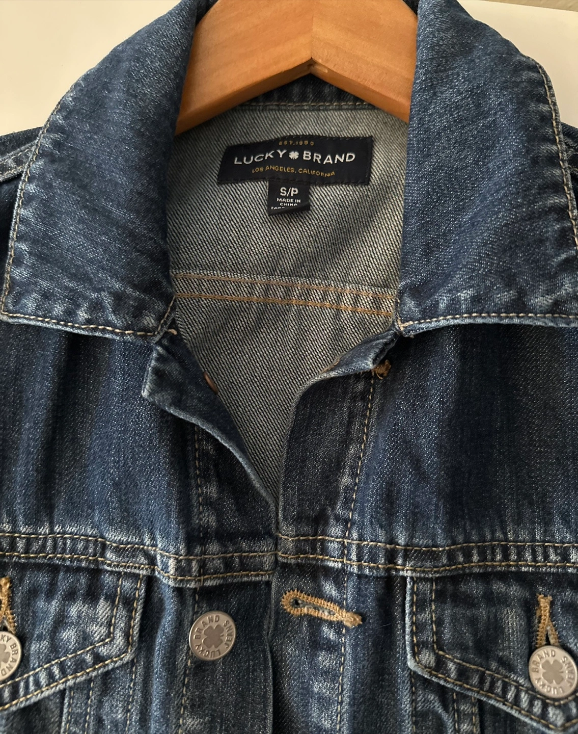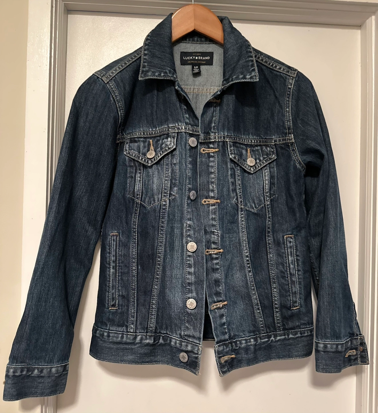 16New - Lucky Brand - Dark Wash Denim Jacket Size S/P Estimated retail: $79.50 Perfect new jacket for summer and fall! Dress it up, dress it down, denim goes with everything! * Tomboy Trucker- style * Jean jacket silhouette * Point collar; crew neckline * Long sleeves * Straight hemline * Relaxed body and fit * Angled flap pockets * Full button-up closure * Approx. 26" length * 100% Cotton * New, pristine condition * Machine wash cold; tumble dry
