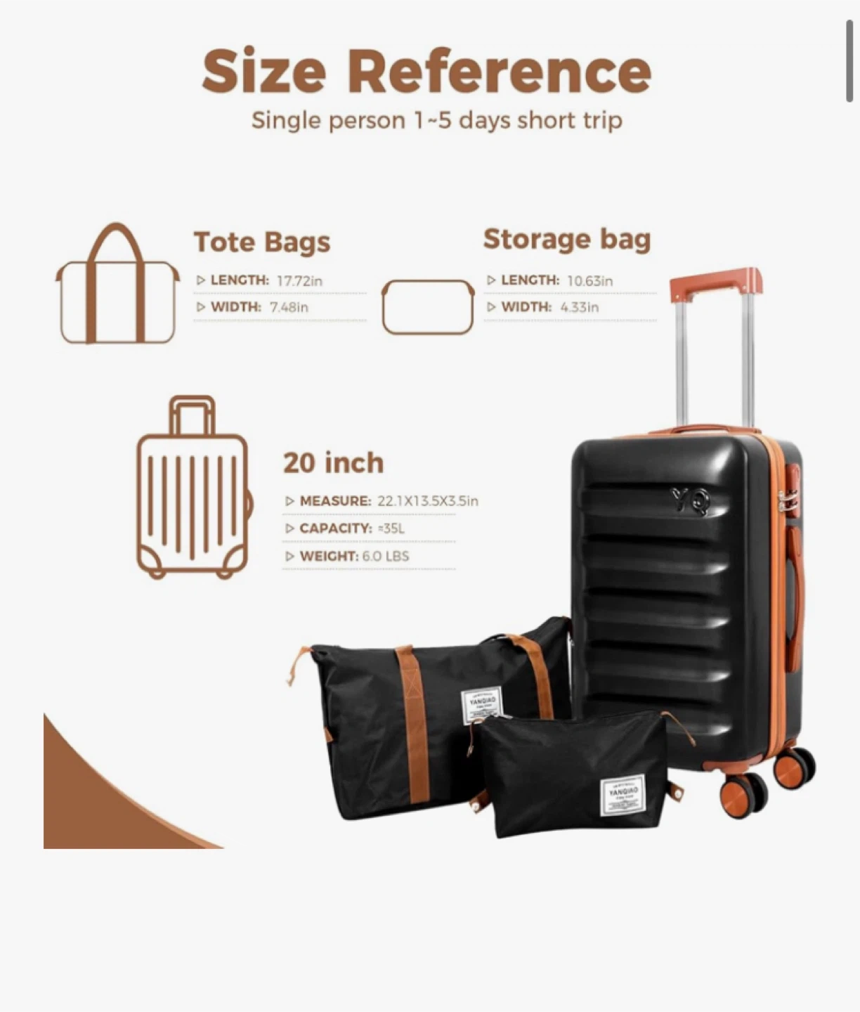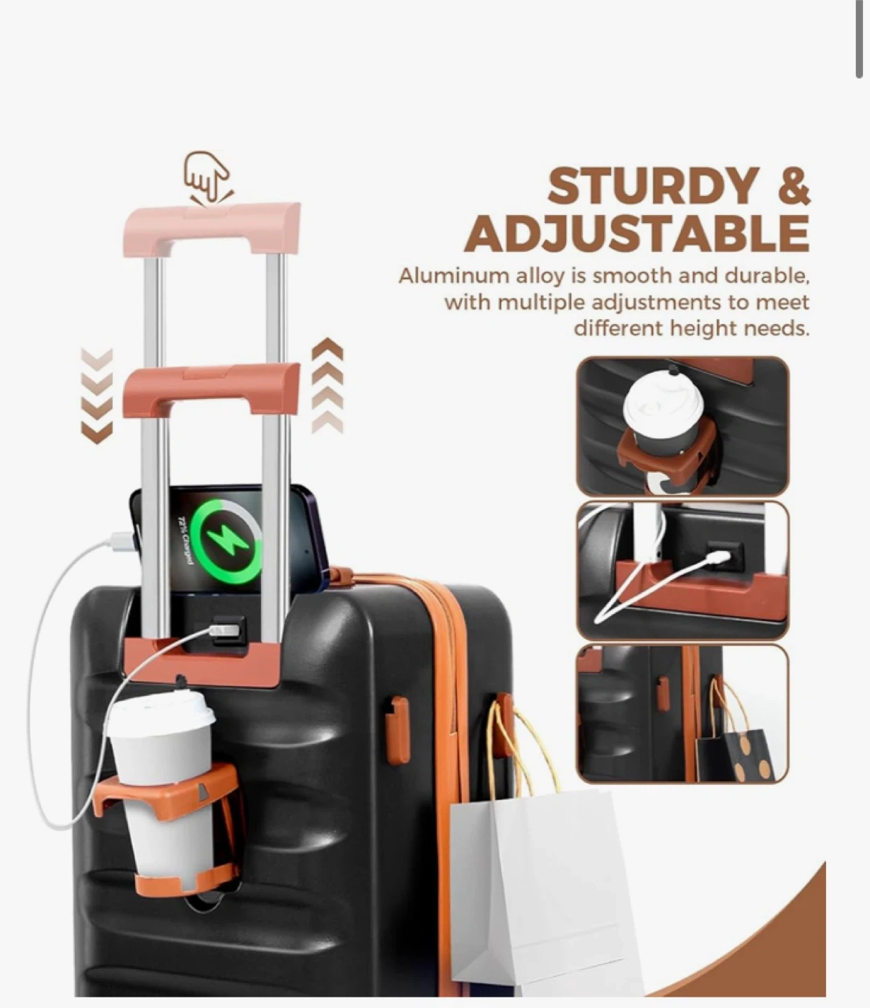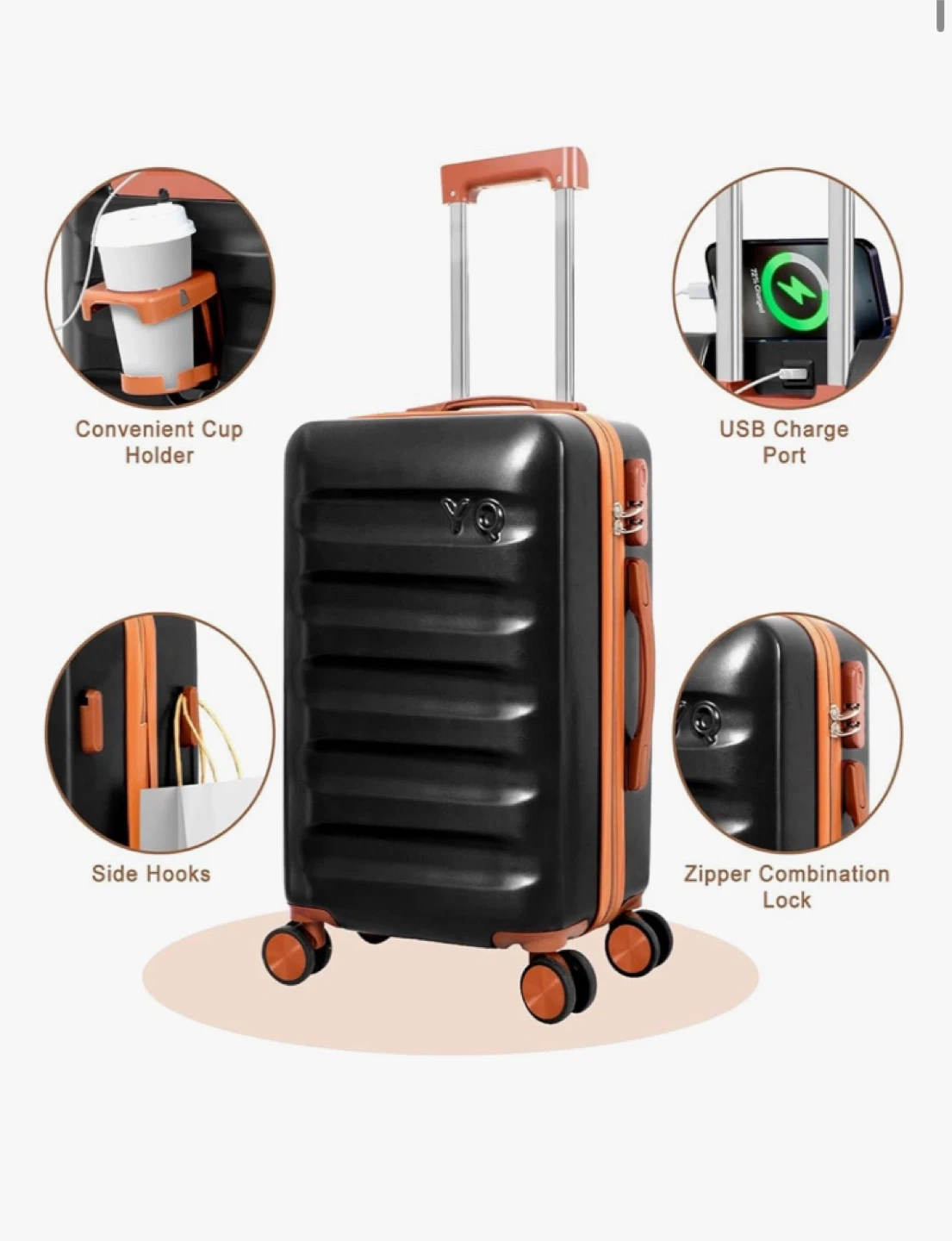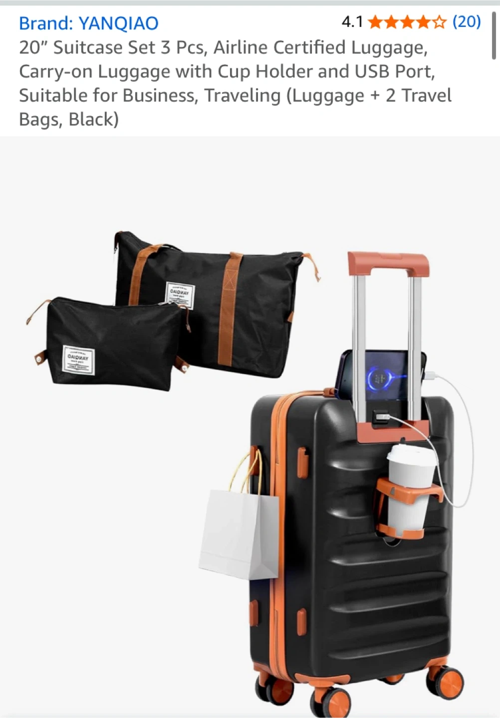 20” Suitcase Set 3 Pcs, Airline Certified Luggage, Carry-on Luggage with Cup Holder and USB Port, Suitable for Business, Traveling (Luggage + 2 Travel Bags, Black) LUGGAGE SET: Includes 20-inch carry-on suitcase, 2 x travel bag (big bag + small bag), designed for travelers, easily meet all kinds of travel needs. Airline certified size, no need to check in, make your journey worry-free. GUARANTEED SECURITY: Equipped with a combination lock to provide extra security for your luggage. Internal zipper compartment and elastic band design, multi-compartment layout ensures that each item has its own place, making your luggage neatly organized and easy to find. DURABLE AND WATERPROOF: The luggage is made of ABS+PC material, combining lightweight and sturdy, durable and long-lasting. The travel bag is made of polyester fabric, with wet and dry pocket design inside to keep your belongings dry and easier to organize. LESS BURDENING: Equipped with 4 360-° swivel wheels for smooth movement and improved ride comfort. Passed drop load test and wheel rolling test to ensure the luggage can be used reliably in various environments. Telescopic handle design for easy maneuverability and reduced arm pressure for long time use. ENHANCED EFFICIENCY: The travel bag is designed with a trolley sleeve that attaches to the retractable handle of the suitcase, enhancing travel convenience. The seven-piece organizer bag makes your luggage storage more neat and orderly, makes full use of luggage space, and makes every trip easier and more efficient.