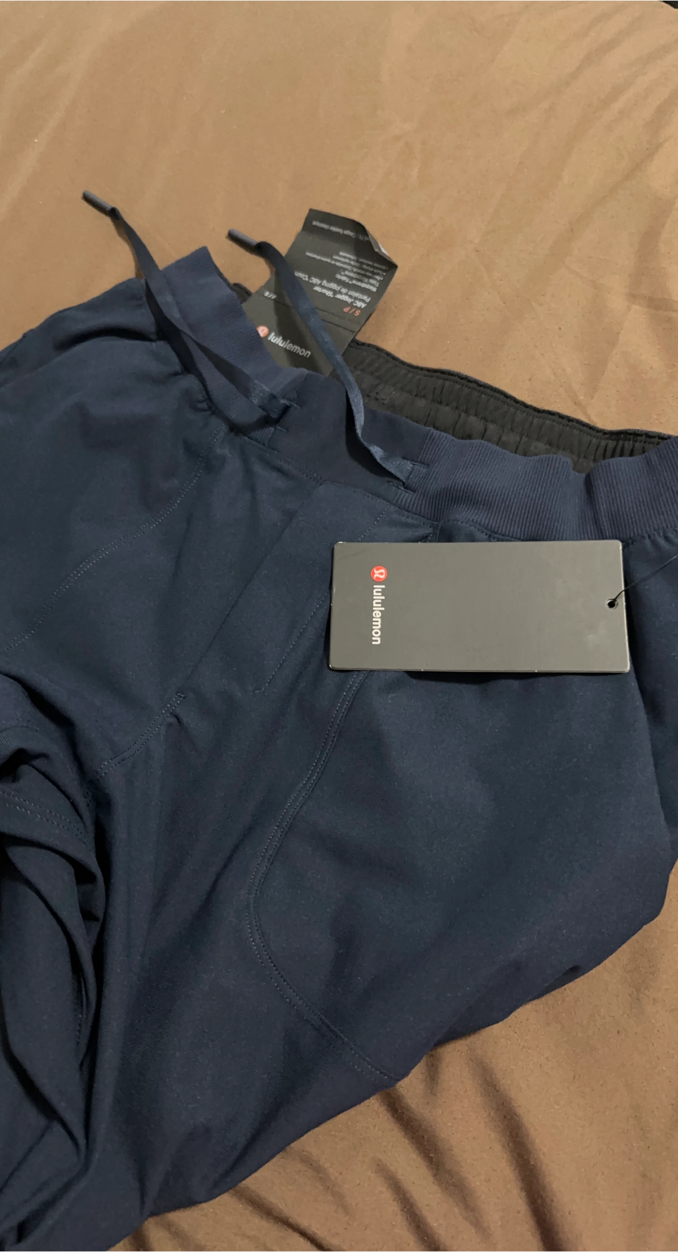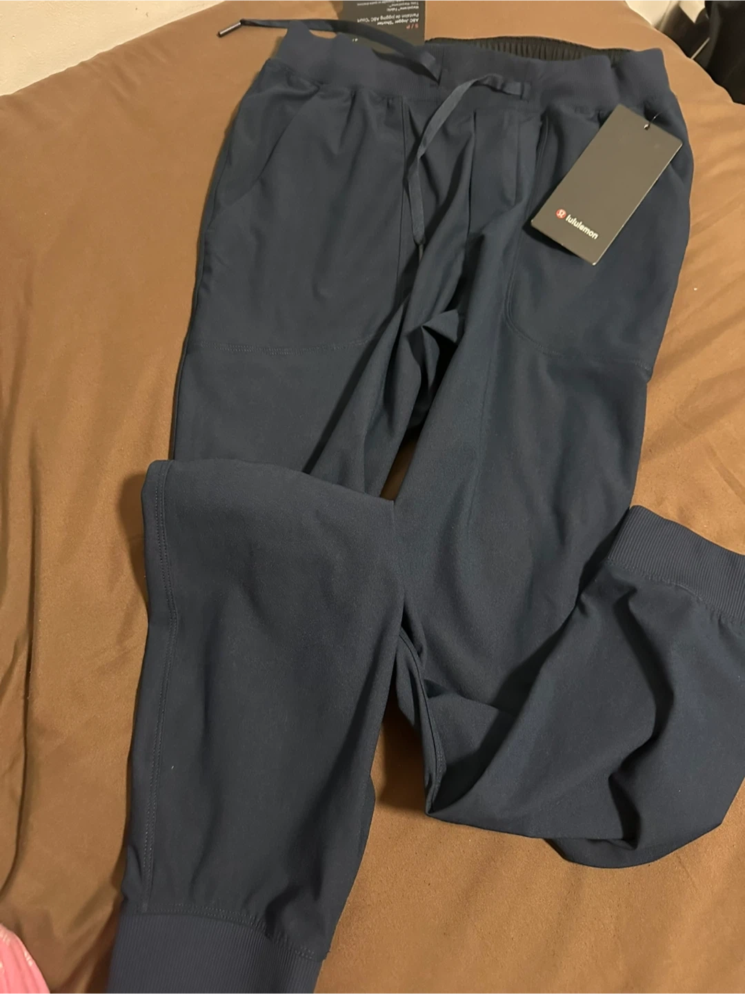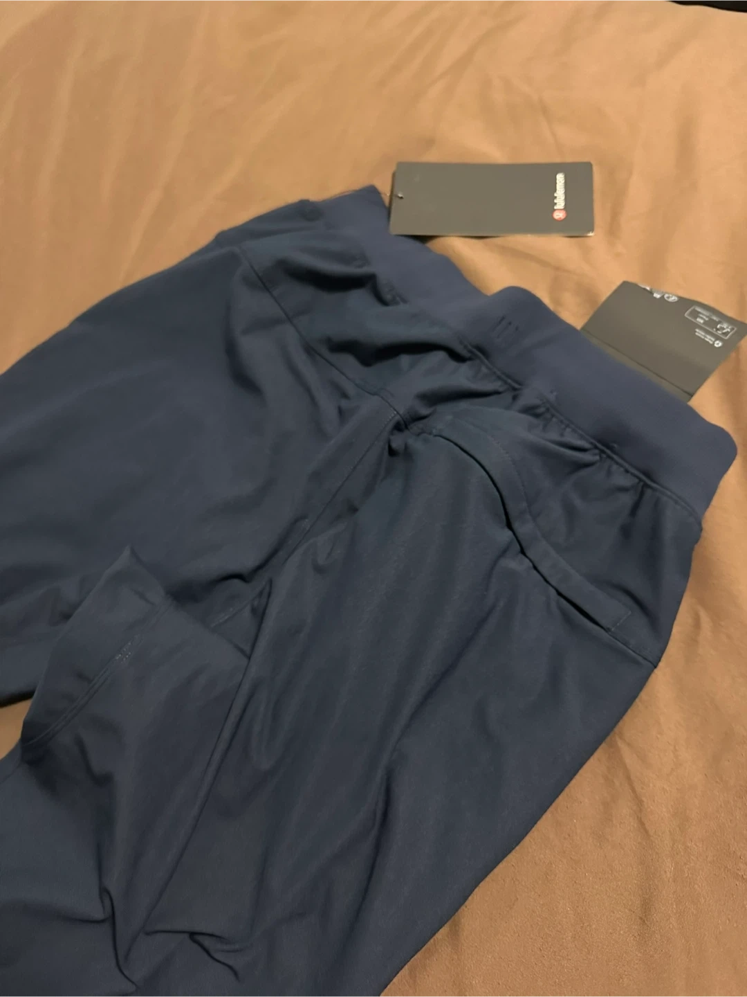 15These are a pair of Lululemon jogger pants in new condition with tags still attached! They feature a comfortable design perfect for workouts or casual wear. The pants are a stylish navy blue color and have a drawstring waist for a secure fit