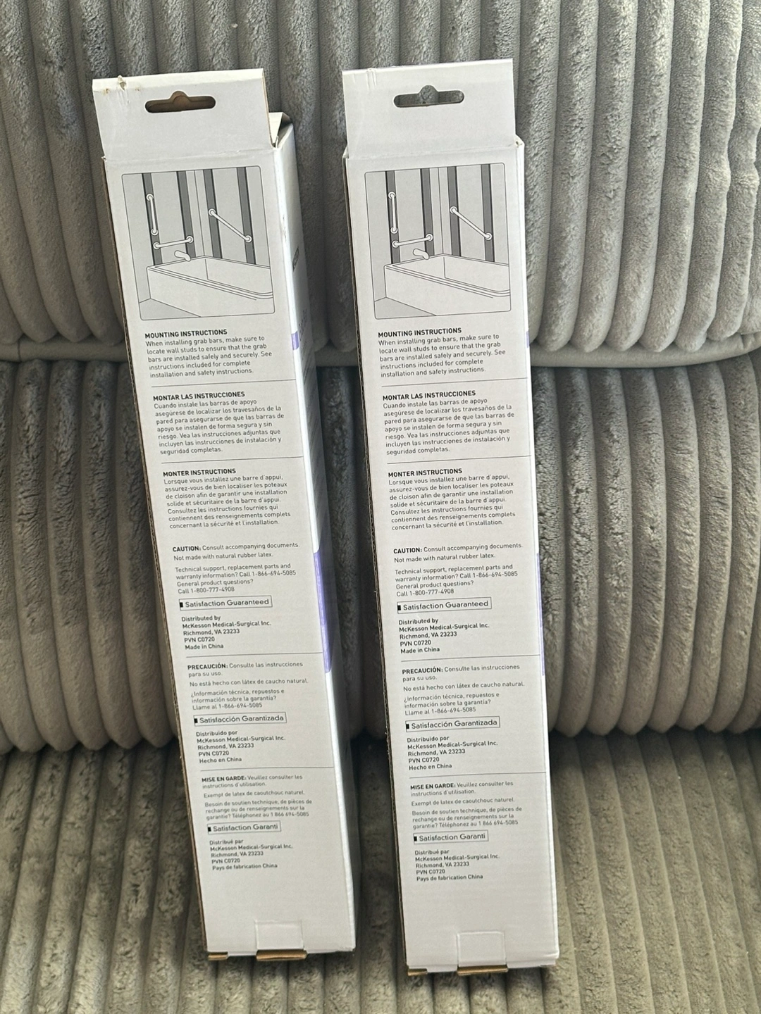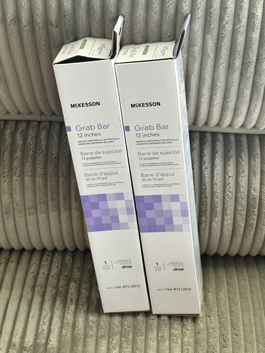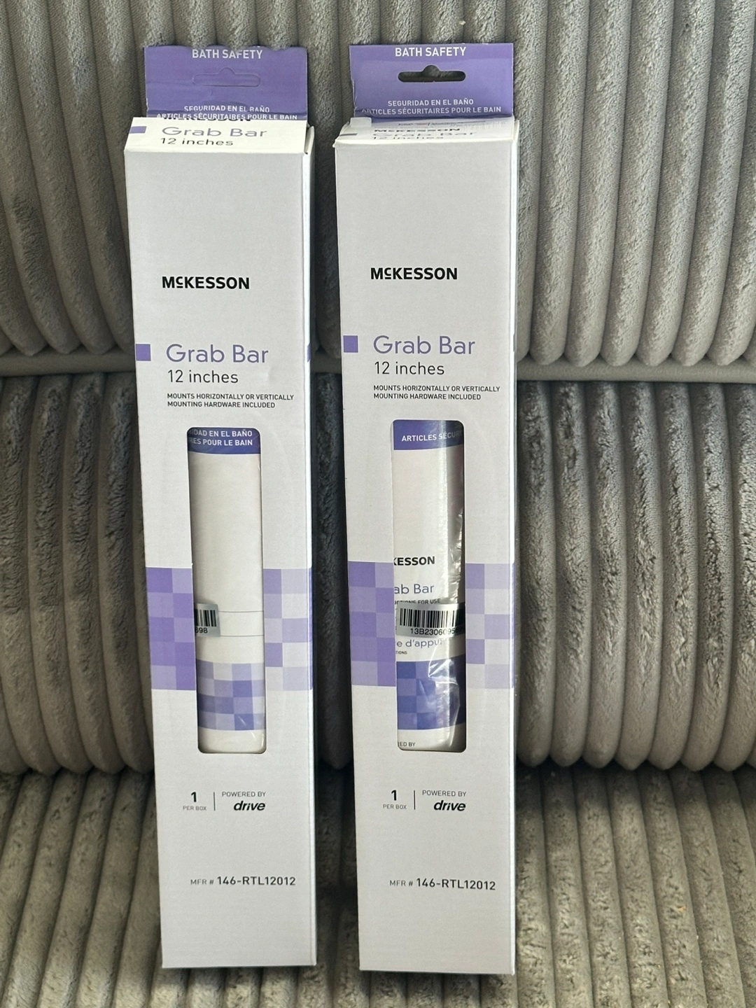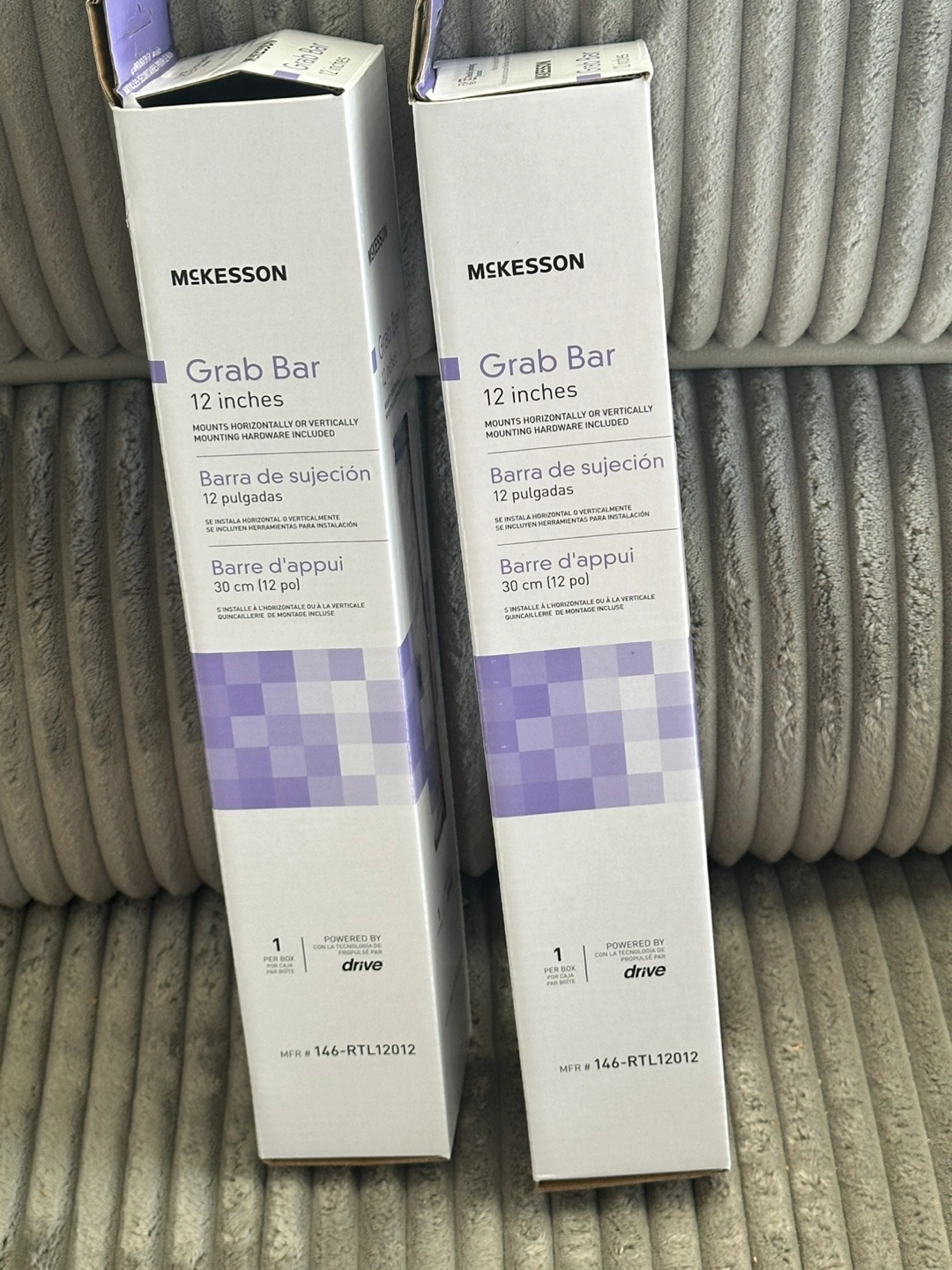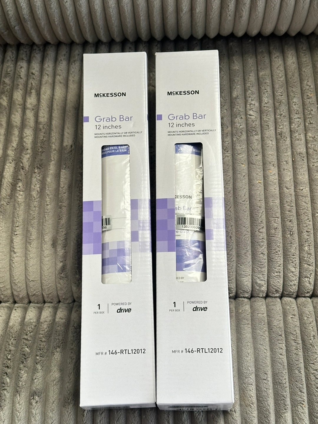 103Two new McKesson 12-inch grab bars. Mounts horizontally or vertically. Mounting hardware included. Bath safety. Powered by Drive. Available for local pickup by Schaumburg and Barrington Road in Schaumburg IL 60194 or shipping to your doorstep for one low price with tracking included for free. Comes from a virus free, smoke free and pet free home.