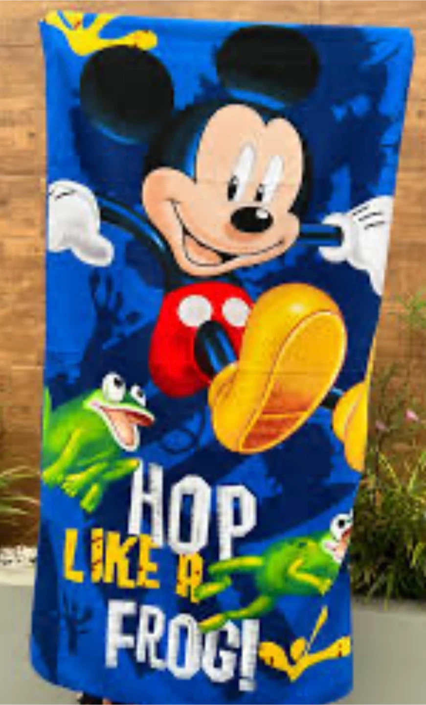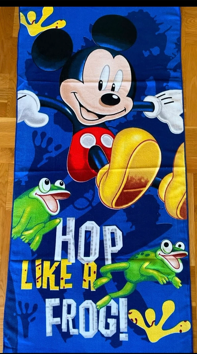 Get ready for some fun in the sun with this vibrant Mickey Mouse beach towel! The towel features Mickey Mouse and playful frogs with the words "Hop Like a Frog!" It's perfect for drying off after a swim or lounging by the pool it is 27.5x55 inches new never used