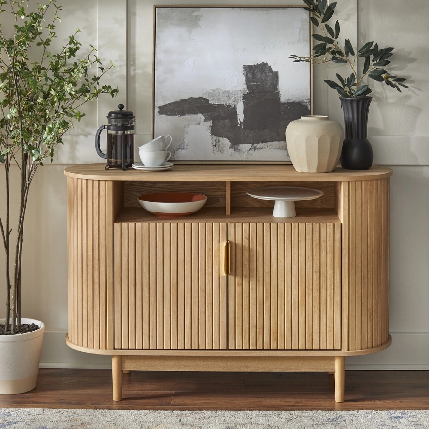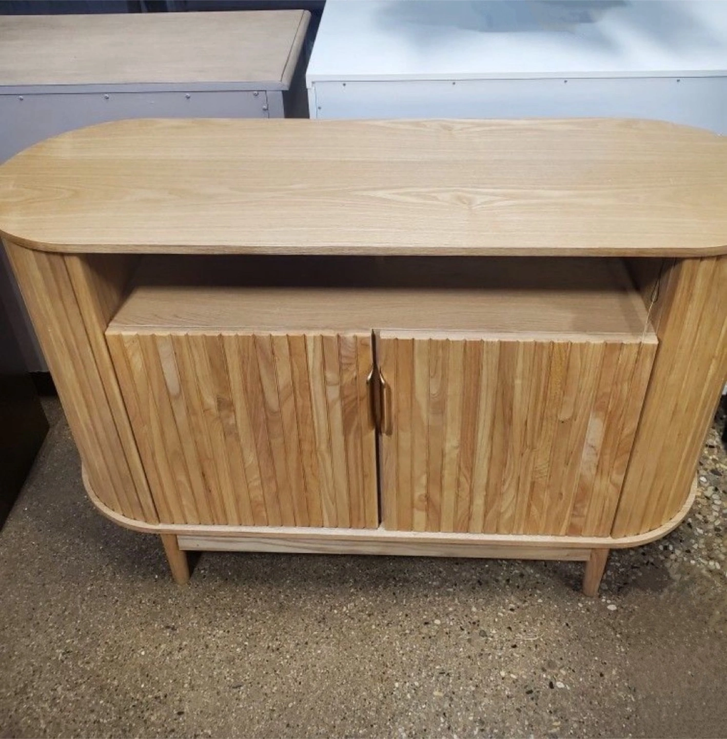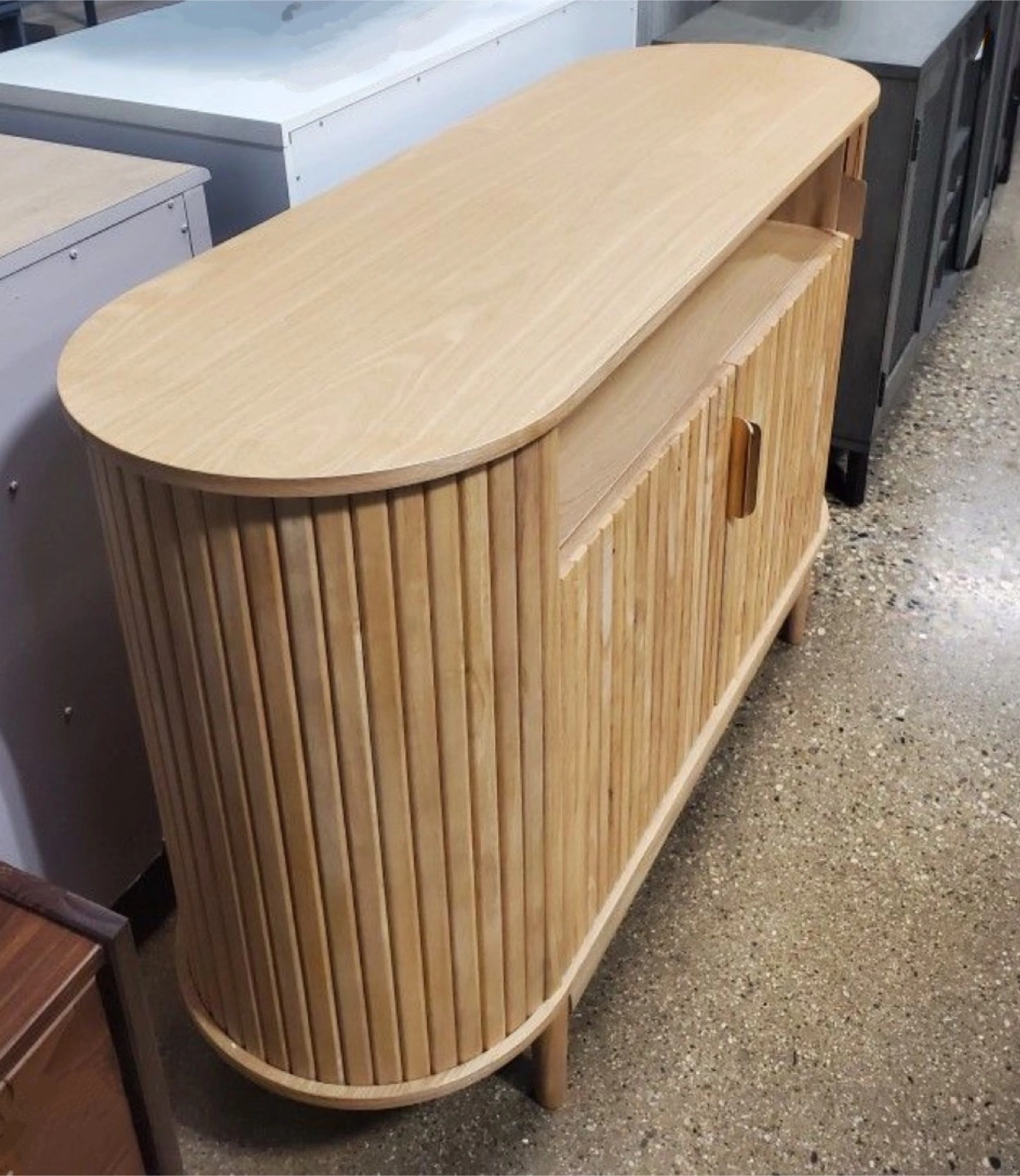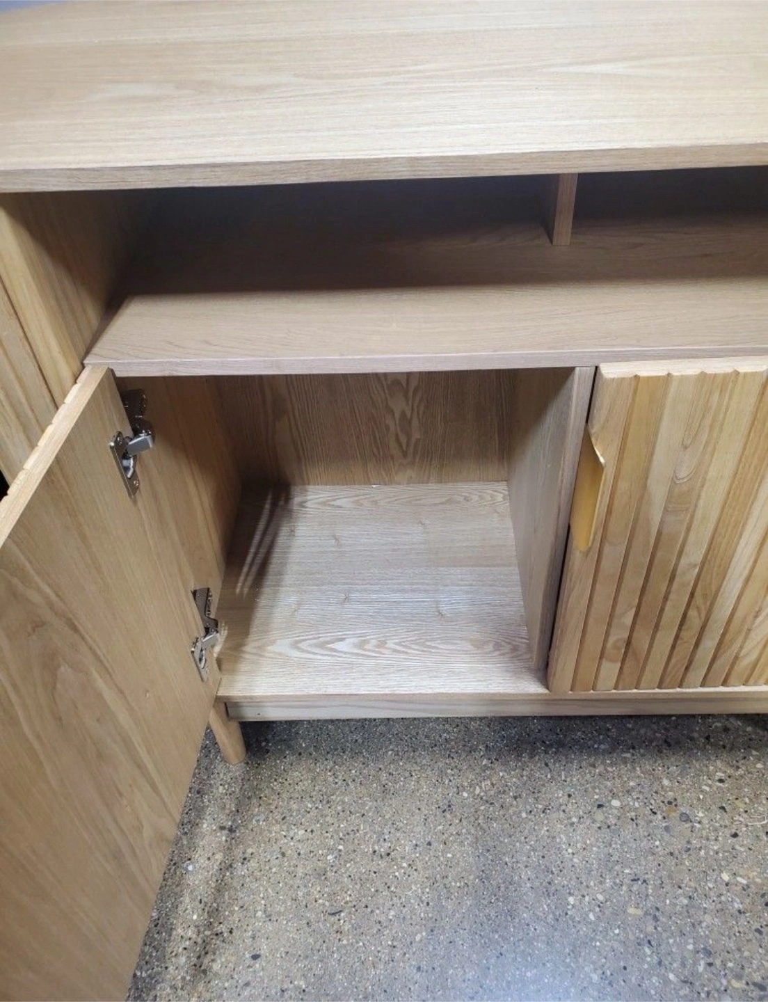 New Mid Century Modern Buffet Sideboard Entryway Storage Table * Floor Model - Must See! * Dimensions: 47.5” W x 15.7” D x 31.5”H * Interior: 17.5'' H X 8.5'' D * Shelf: 8.5'' D X 32'' W * Feet Height - Top to Bottom: 6.75'' H * 2 adjustable shelves behind the cabinet doors provide additional storage * Distinctive groove details and gold-tone metal drawer pulls * The top of the buffet displays beautiful wood grain in a light oak finish * Fluted slates and legs * Curved ends add a unique style * Fully assembled * Trusted Seller / Read/ See My Reviews! Follow Me For Amazing Deals Listed Daily!