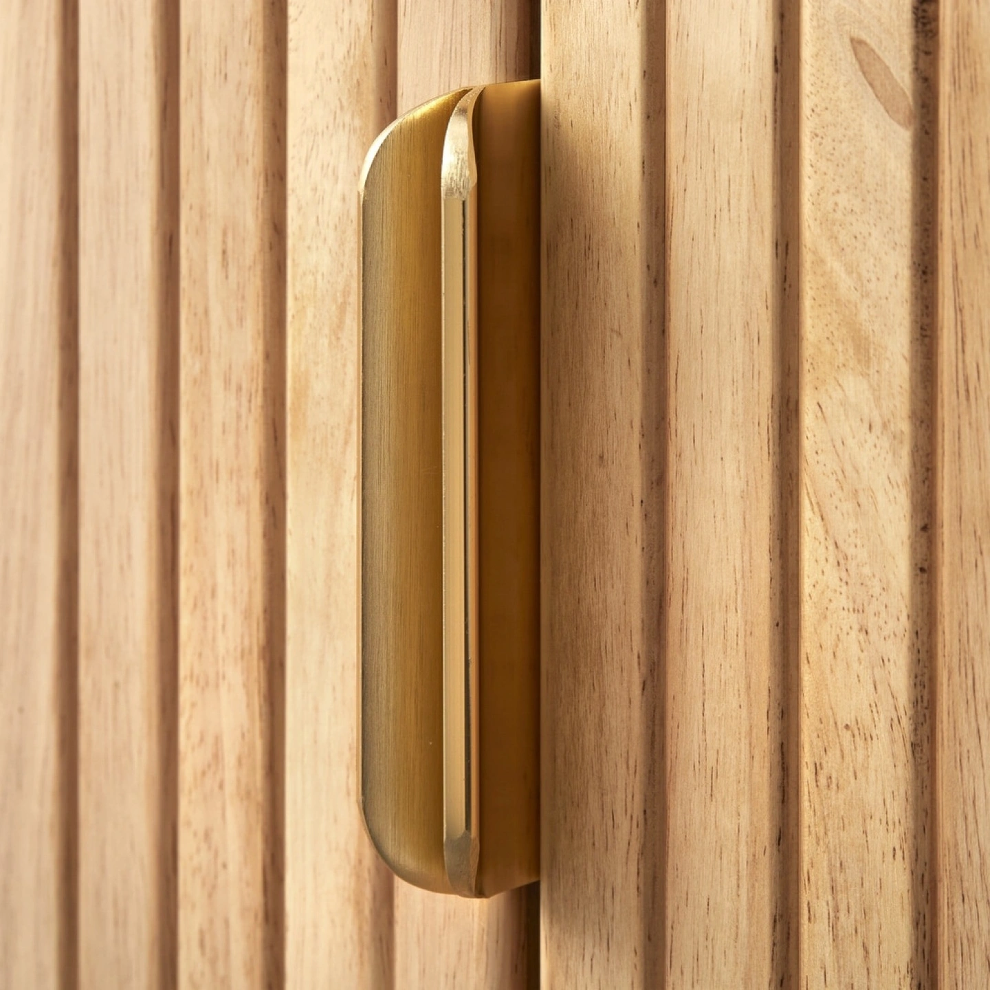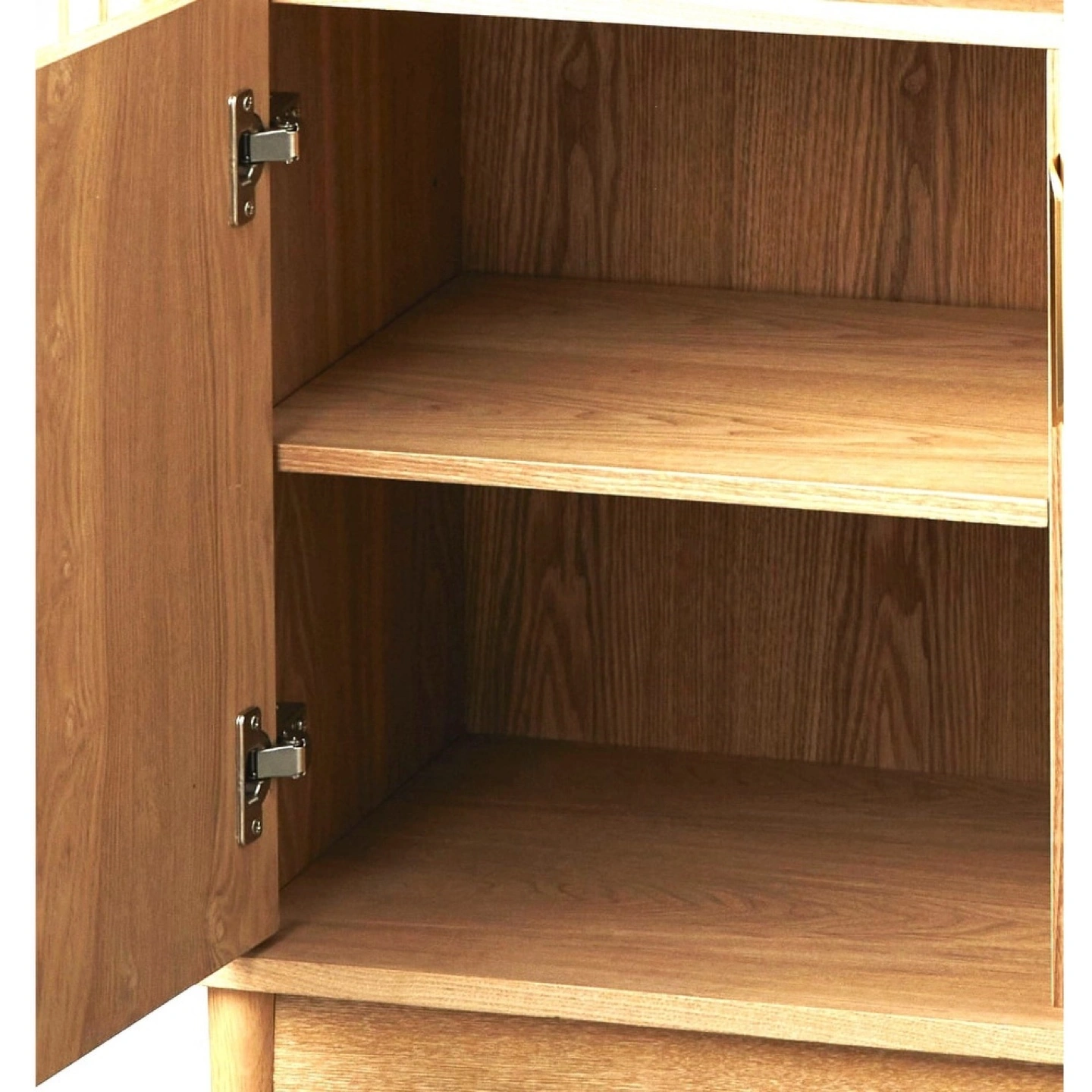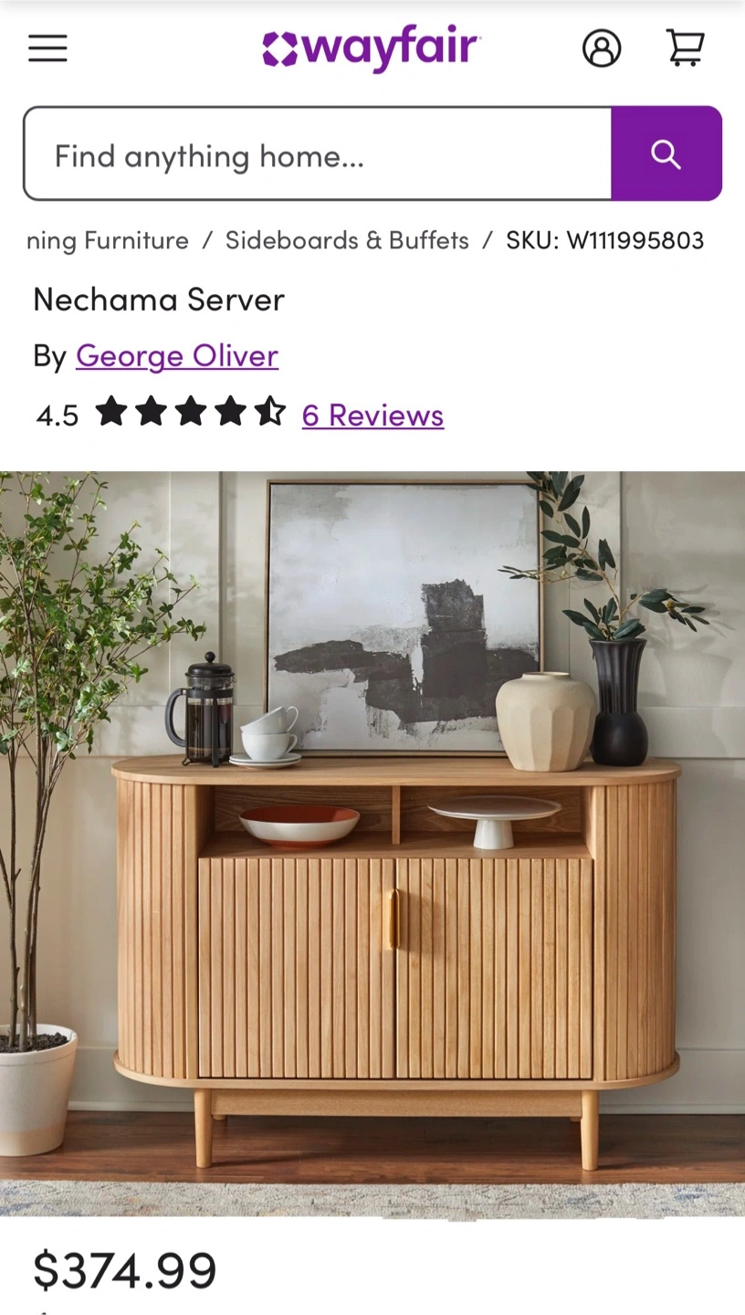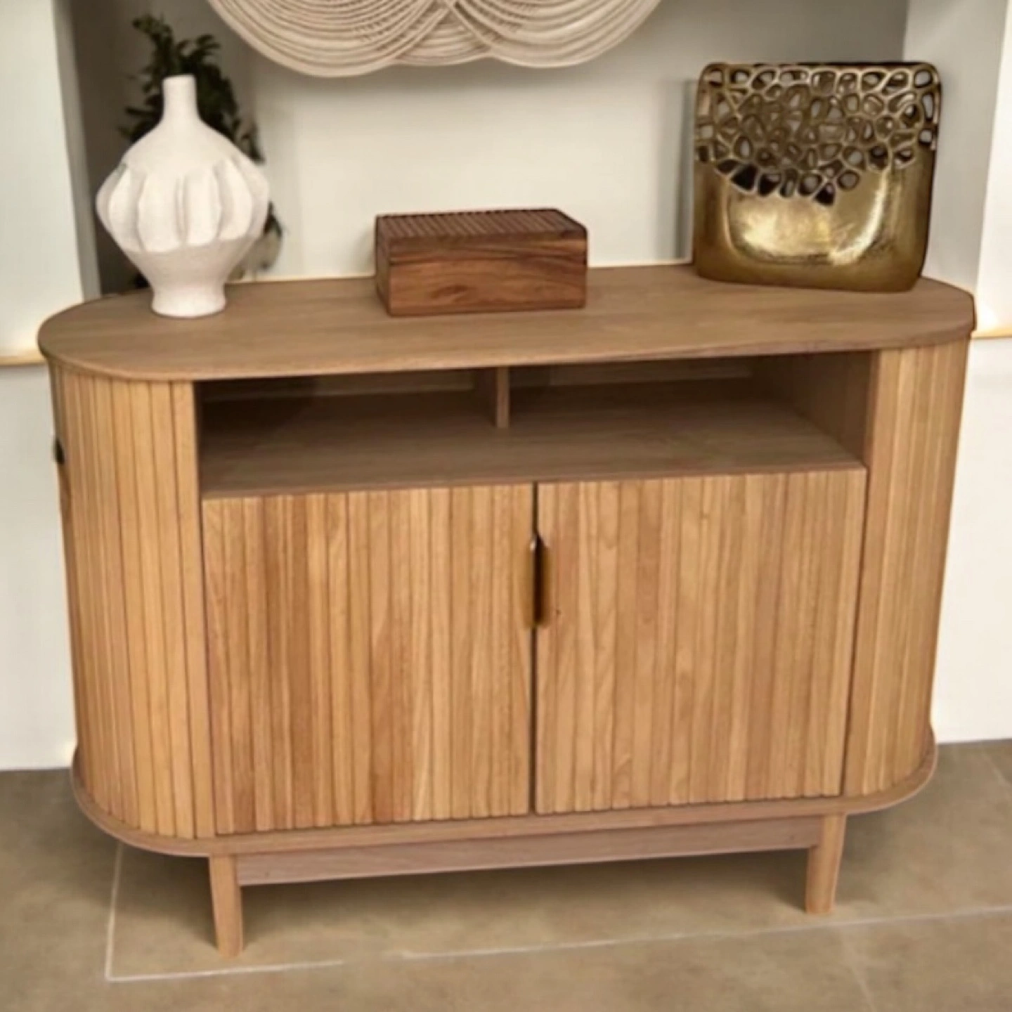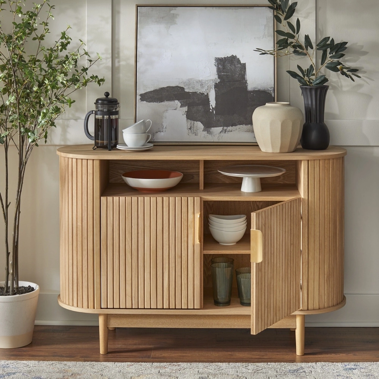 New Mid Century Modern Buffet Sideboard Entryway Storage Table * Floor Model - Must See! * Dimensions: 47.5” W x 15.7” D x 31.5”H * Interior: 17.5'' H X 8.5'' D * Shelf: 8.5'' D X 32'' W * Feet Height - Top to Bottom: 6.75'' H * 2 adjustable shelves behind the cabinet doors provide additional storage * Distinctive groove details and gold-tone metal drawer pulls * The top of the buffet displays beautiful wood grain in a light oak finish * Fluted slates and legs * Curved ends add a unique style * Fully assembled * Trusted Seller / Read/ See My Reviews! Follow Me For Amazing Deals Listed Daily!