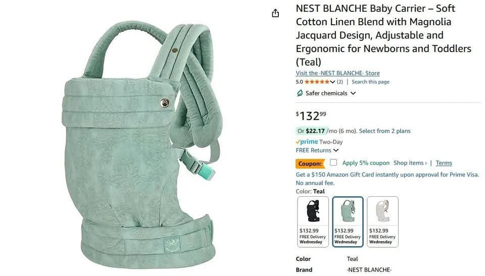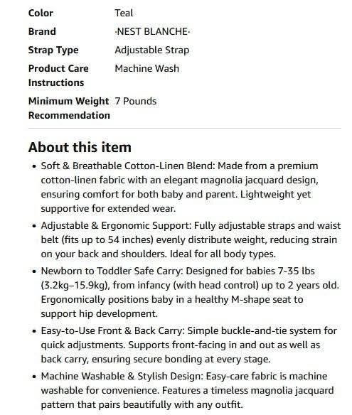 Show allNew~NEST BLANCHE Baby Carrier, Soft Cotton Linen, NB, Tots(Teal)