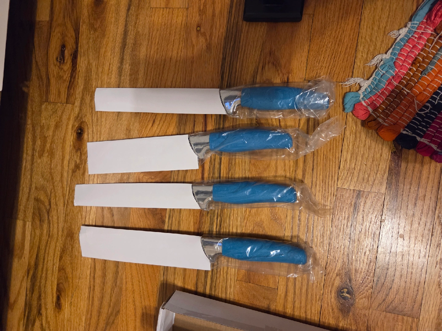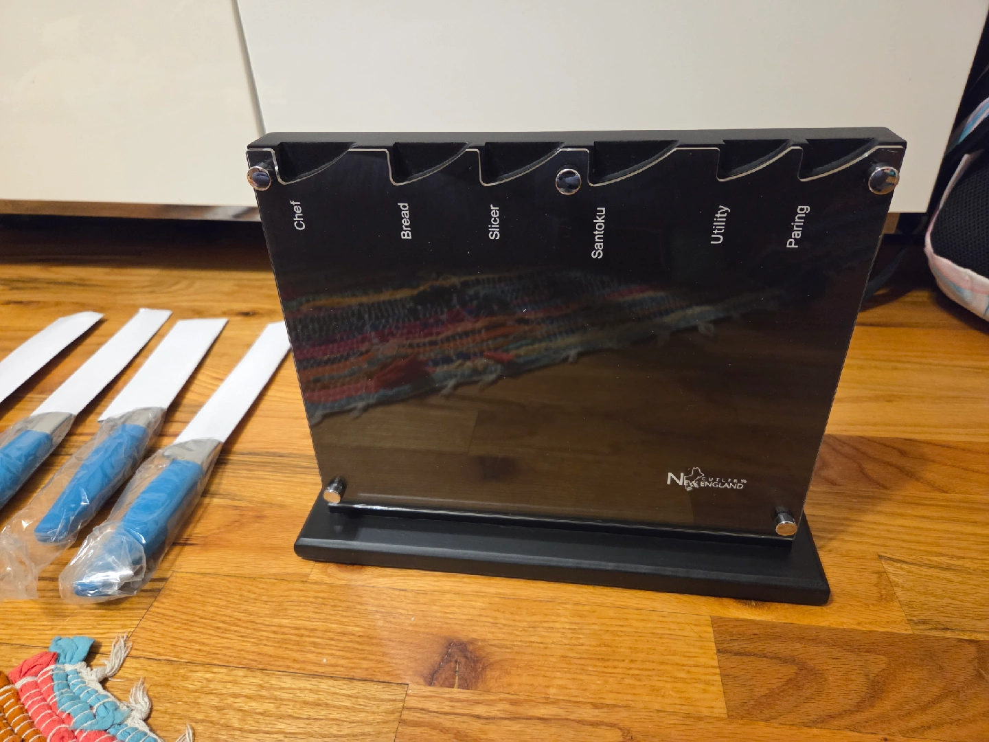 I'm selling a brand new, still-in-packaging Nexus England 4-piece knife set! The knives have a beautiful blue handle and come with a sleek black knife block. Perfect for any kitchen!