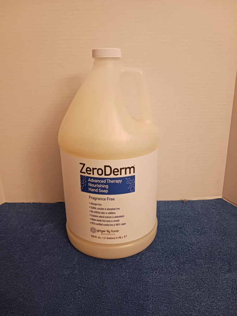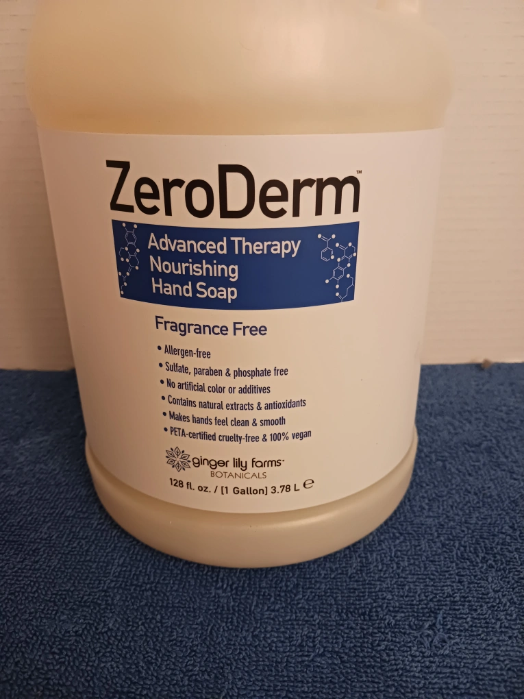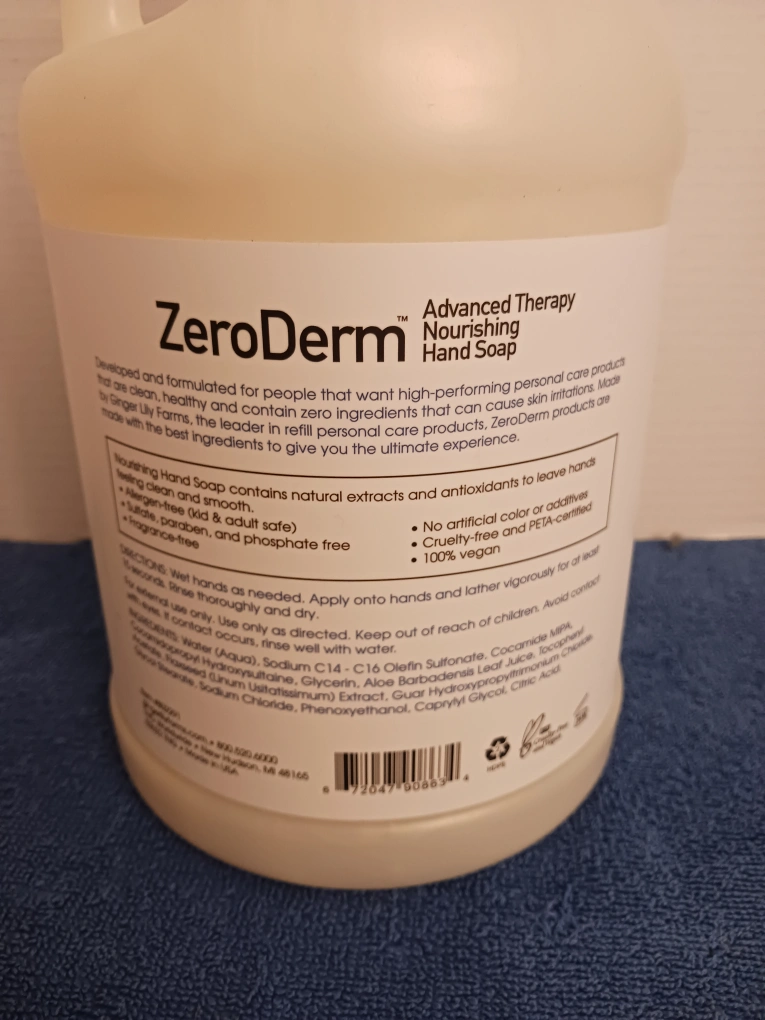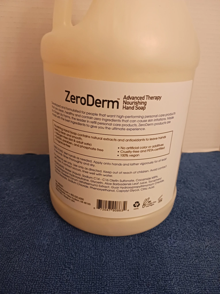 Here's a 1-gallon jug of ZeroDerm Advanced Therapy Nourishing Hand Soap! It's fragrance-free and contains natural extracts and antioxidants. It's also sulfate, paraben, and phosphate-free, with no artificial colors or additives. Plus, it's cruelty-free and 100% vegan, making hands feel clean and smooth