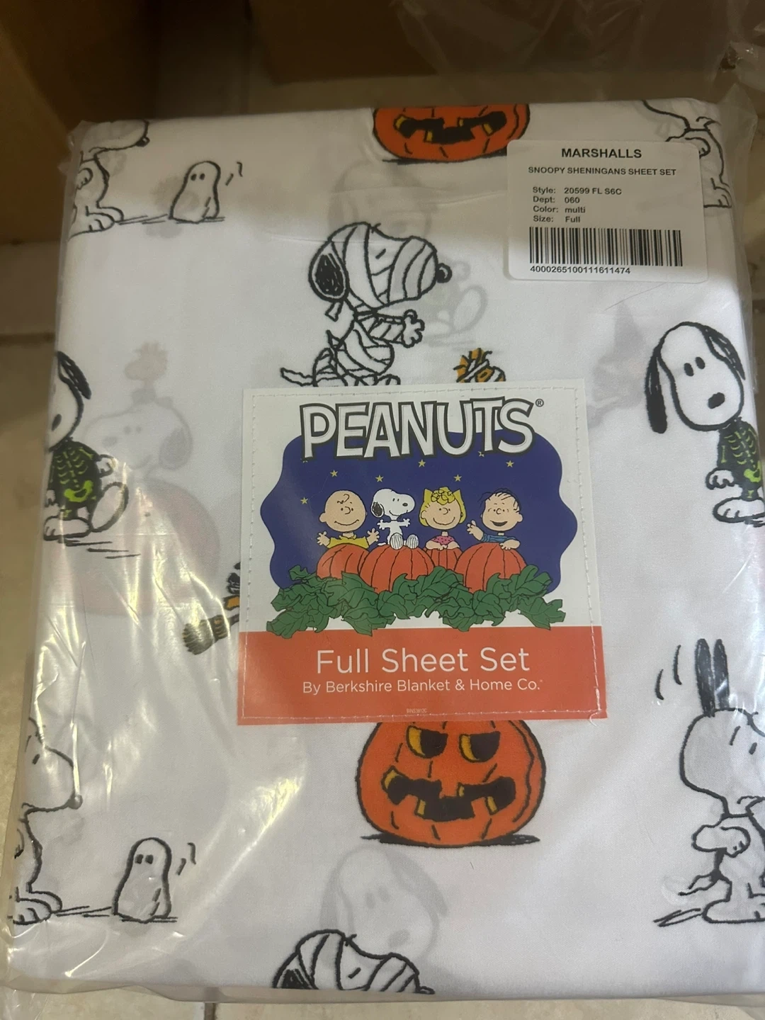10I'm selling a brand new Peanuts Snoopy full sheet set by Berkshire Blanket & Home Co! The set includes a full flat sheet (205cm x 244cm), a full fitted sheet (138cm x 190cm x 35cm), and two standard pillowcases (51cm x 76cm)