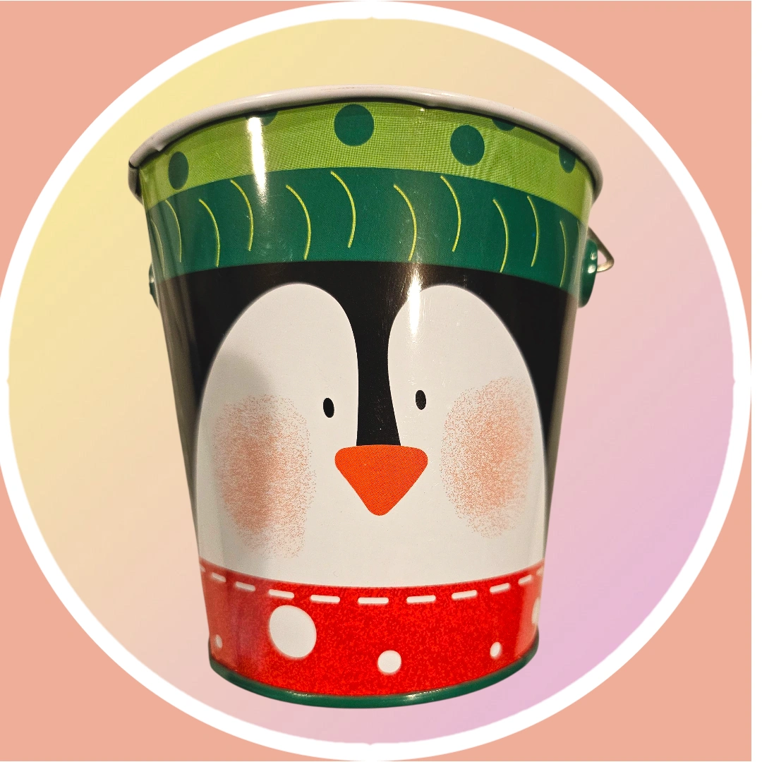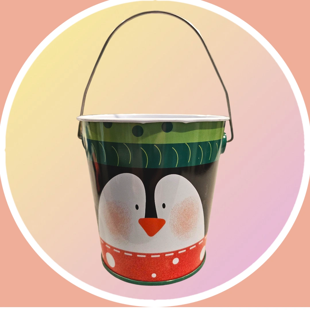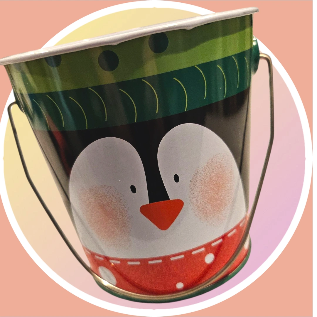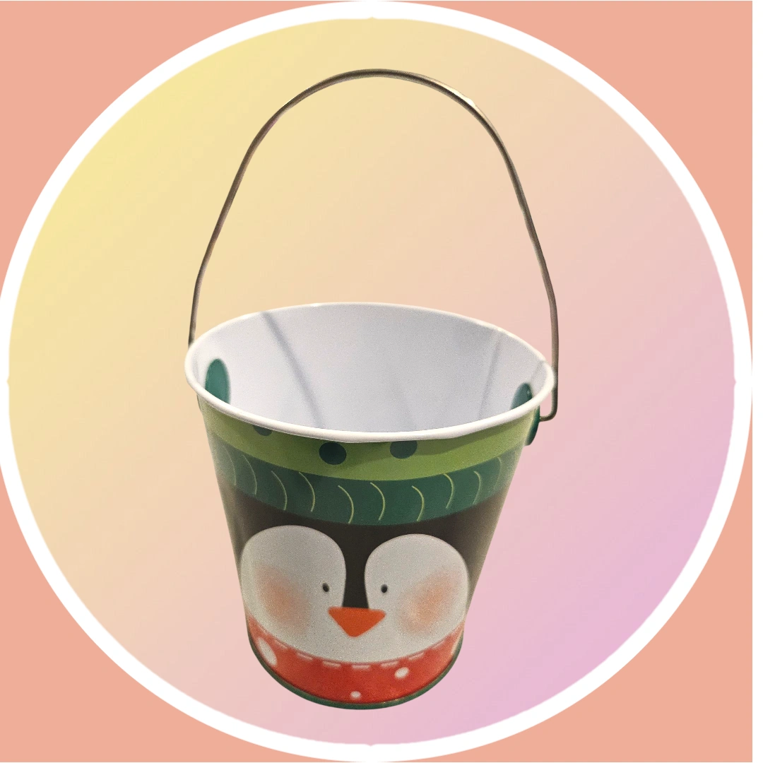 20NEW Here's a cute bucket with a penguin design! It's perfect for storing small items or as a decorative piece or holding candy, cookies, or as a gift container. 4x4x4.625-in. bucket also features a handle for easy carrying. They make unique goodie bags, giveaway items, candy tubs, candle holders, centerpieces, and more. You can even fill them up with crayons, colored pencils, small toys, and other items. Make your next event a smash hit with these Voila Animal Printed Tin Pails!