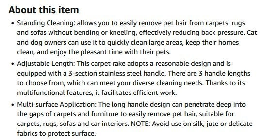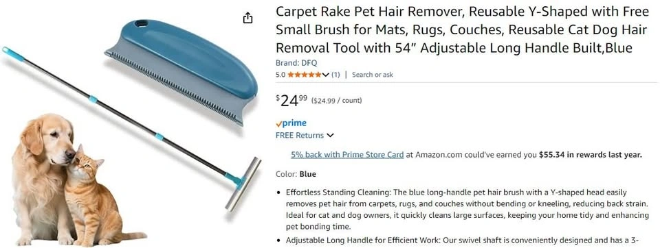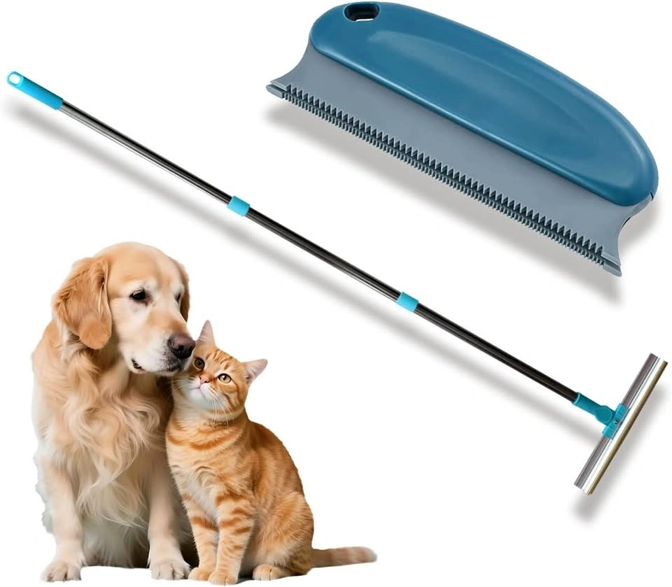 New~Pet Hair Removal Rake, 54" Adj Handle, W/Small Brush