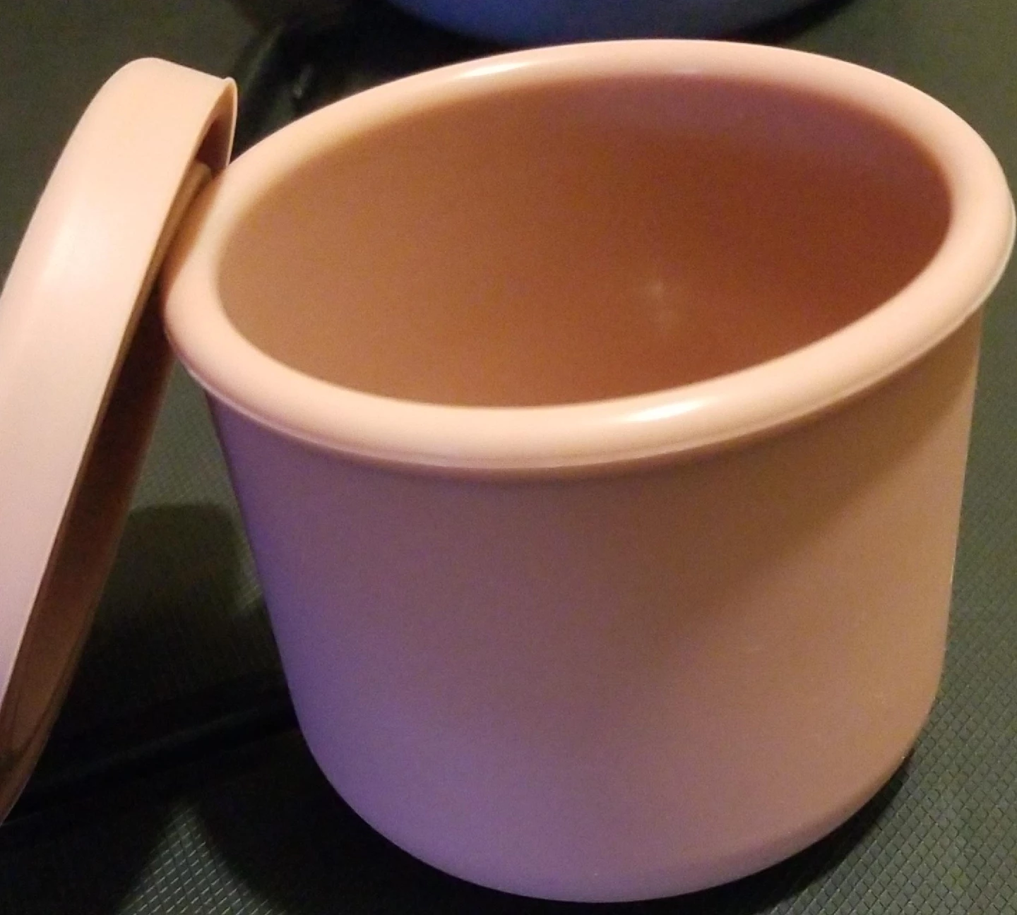 Here's a small pink silicone container with a lid. It's in good condition and ready for a new home! Cash only please.