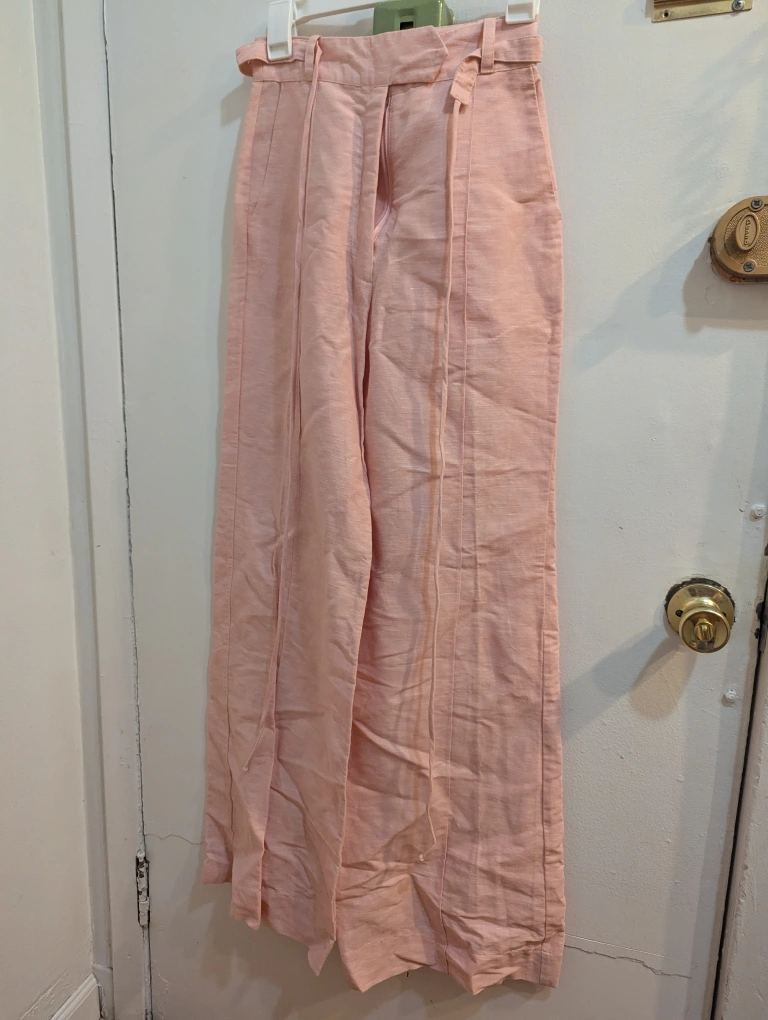 These are wide-leg linen pants with a light pink color. They have a belt as well. Never worn! A little crumpled from storage.