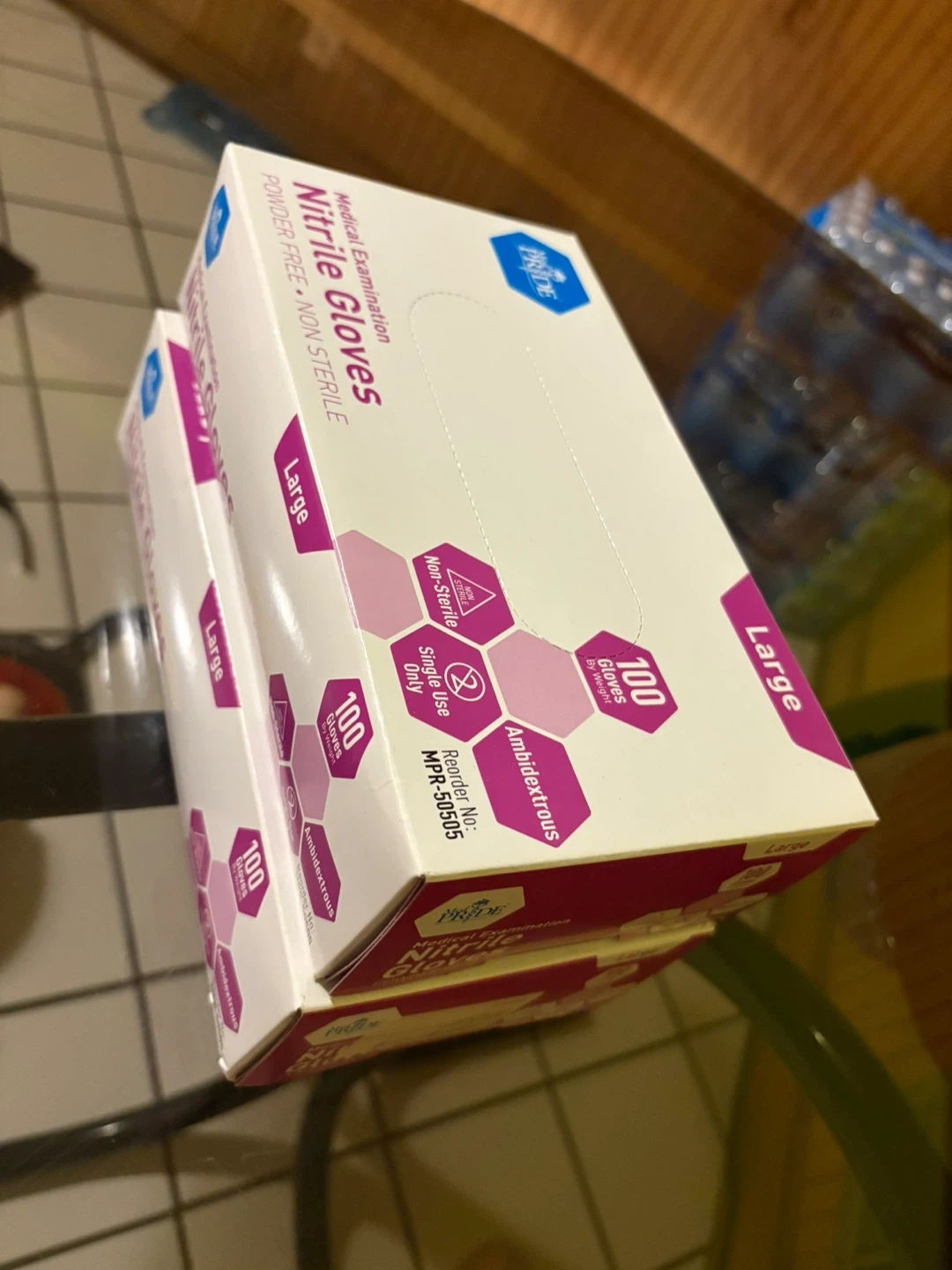 60I have 2 boxes of Pride Medical Examination Nitrile Gloves for sale! They are powder-free and non-sterile. Each box contains 100 gloves by weight. These are size Large and ambidextrous, perfect for single use