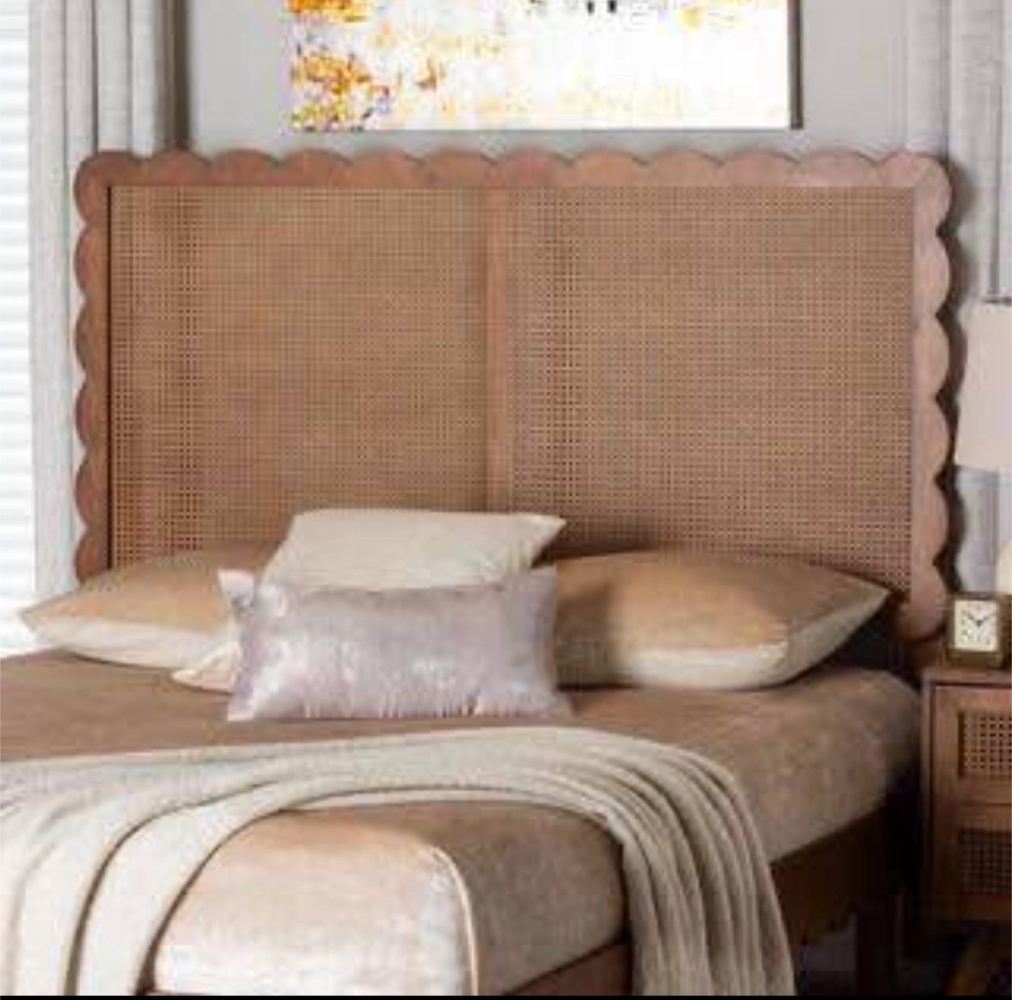 New Queen Size Scallop Rattan Boho Mid Century Modern Headboard * New In The Box /Excellent Condition * Dimensions: 62.20” W x 49.50”-59.50” H * Elegant scalloped border - features beautifully scalloped edges * Woven rattan panel - woven detailing within the panel creates an airy bedroom backdrop with rich texture * Broad outline - the outline blends well with a variety of room styles while drawing attention to the unique aspects of the piece * Headboard is designed to attach to your current bed frame. * 6 adjustment holes placed 2.5 in. apart offer 5 unique height adjustment settings * Verified/Trusted Seller - See/Read My Reviews - Follow Me For Great Deals! * 13-QH