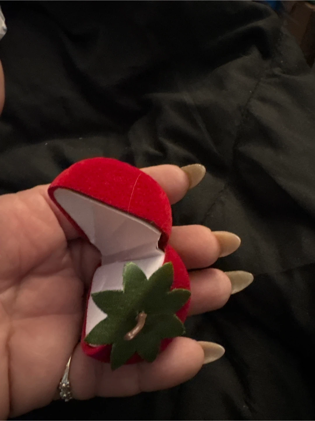 1000+This is a cute red strawberry ring box. It's perfect for holding a special ring or other small jewelry items. The inside is white and the outside is a soft, velvety red. NEW