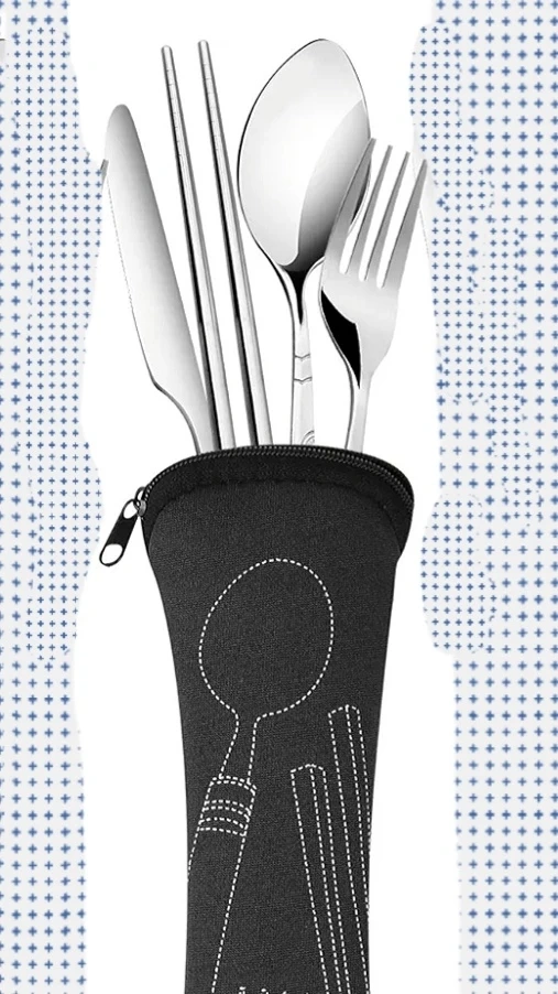 261This is a portable utensil set that includes a fork, spoon, knife, and chopsticks, all neatly stored in a convenient carrying case. Reusable Stainless steel Flatware Sets Knife, Fork, Spoon, Chopsticks, 4Pcs Portable Travel Stainless Steel Tableware Dinnerware with Carrying Case. Perfect for taking your meals on the go! The utensils are about 7 inches long. They're lightweight and easy to clean, making them great for picnics, camping, or lunch at work. It's Brand New. Cash only please.