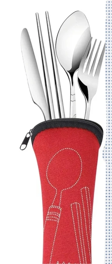 261This is a portable utensil set that includes a fork, spoon, knife, and chopsticks, all neatly stored in a convenient carrying case. Reusable Stainless steel Flatware Sets Knife, Fork, Spoon, Chopsticks, 4Pcs Portable Travel Stainless Steel Tableware Dinnerware with Carrying Case. Perfect for taking your meals on the go! The utensils are about 7 inches long. They're lightweight and easy to clean, making them great for picnics, camping, or lunch at work. It's Brand New. Cash only please.