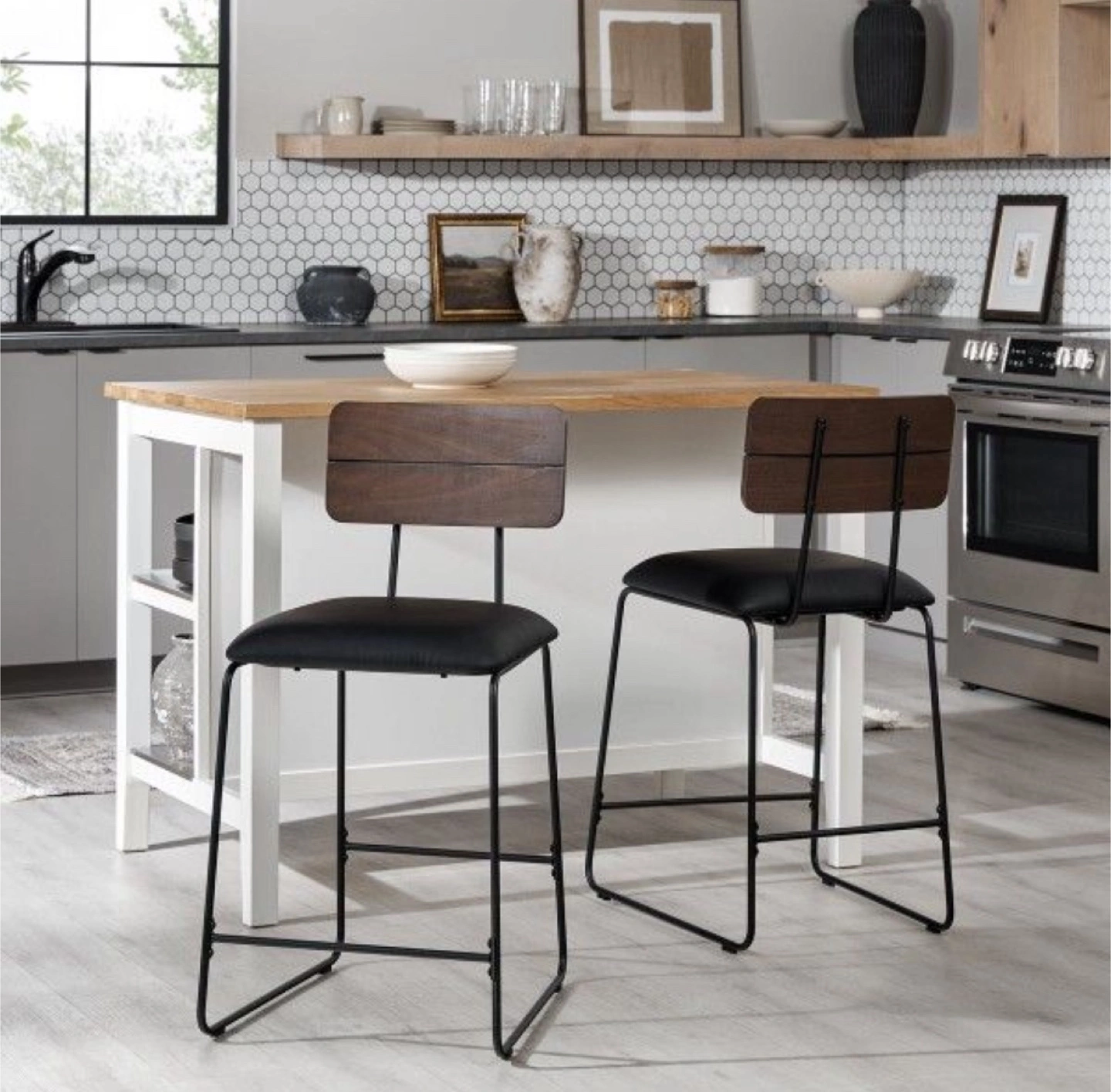 New Set of 2 Sleek Industrial Minimalist Counter Height Stools * New in the Box/Excellent Condition * Dimensions: 18.38" W x 20.75" D x 36.25" H * Fire-resistant and water-resistant cushions * Plastic glides help prevent scratched floors * Durable faux leather seats * Curved wood back * Perfect for any interior design style * Easy Assembly * Trusted Seller / Read/ See My Reviews! Follow Me For Amazing Deals Listed Daily!