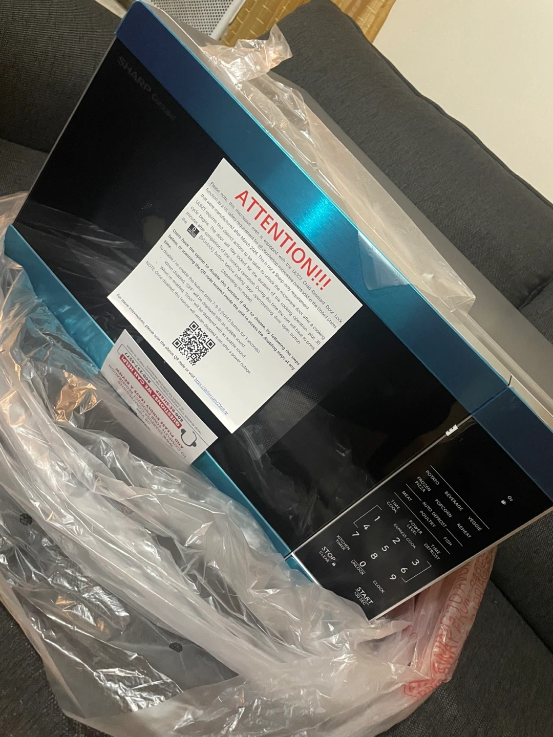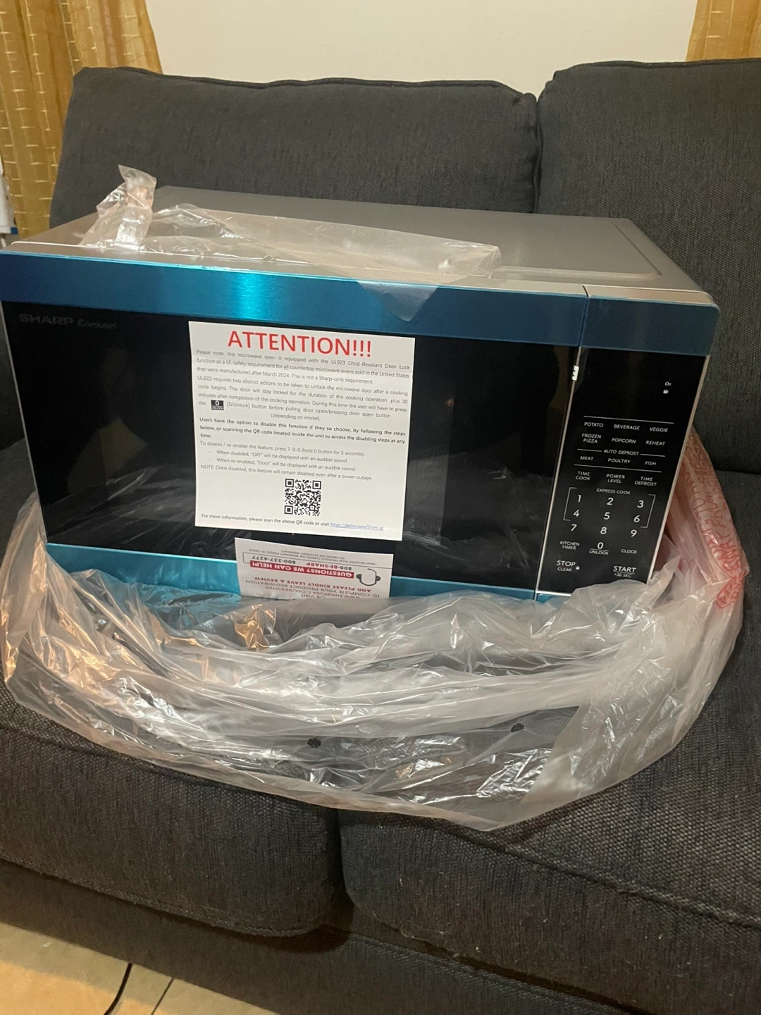 20Selling a brand new Sharp Carousel 1.1 cu. ft. microwave oven in blue! It's still in its original packaging. This microwave features one-touch controls for popular foods and also has an auto defrost setting. The interior is easy to clean, and the compact design fits nicely on any countertop