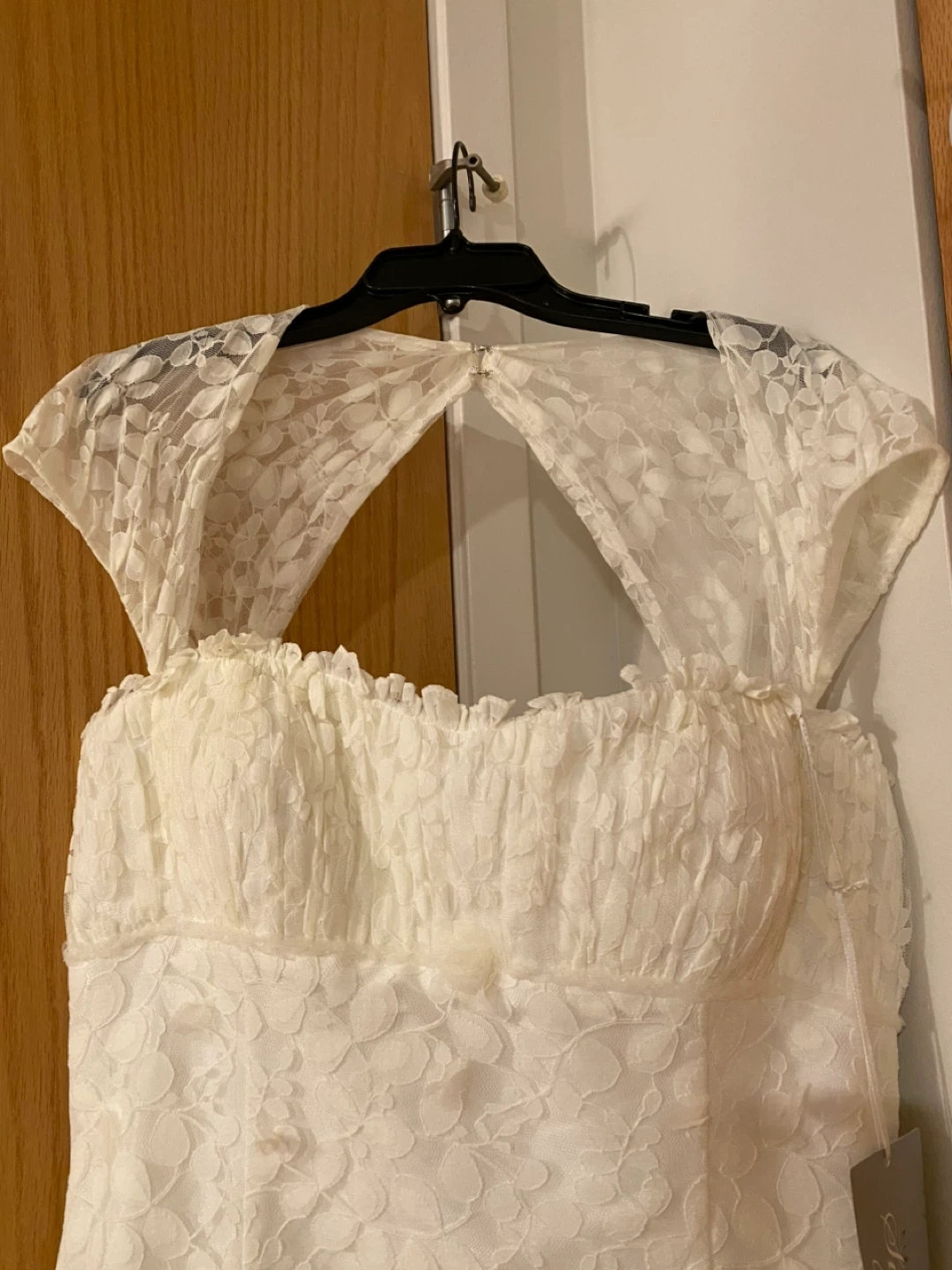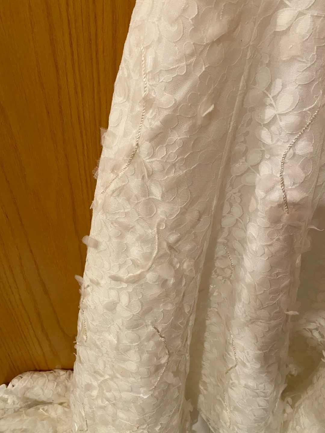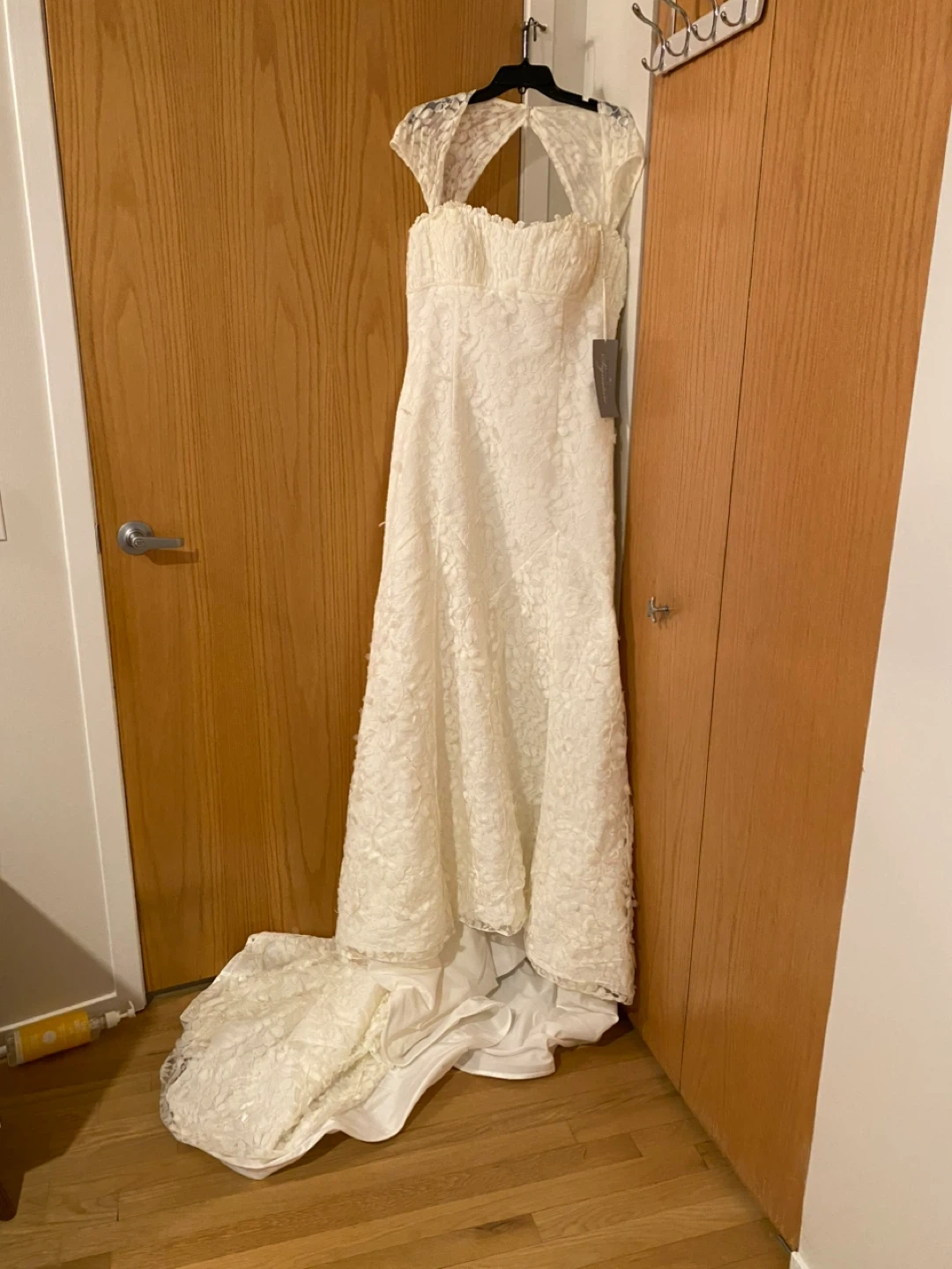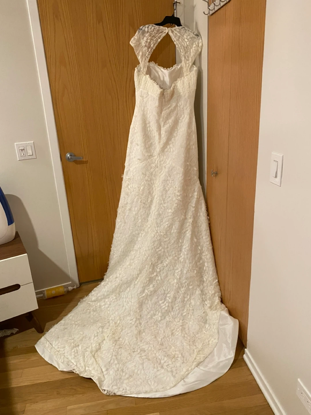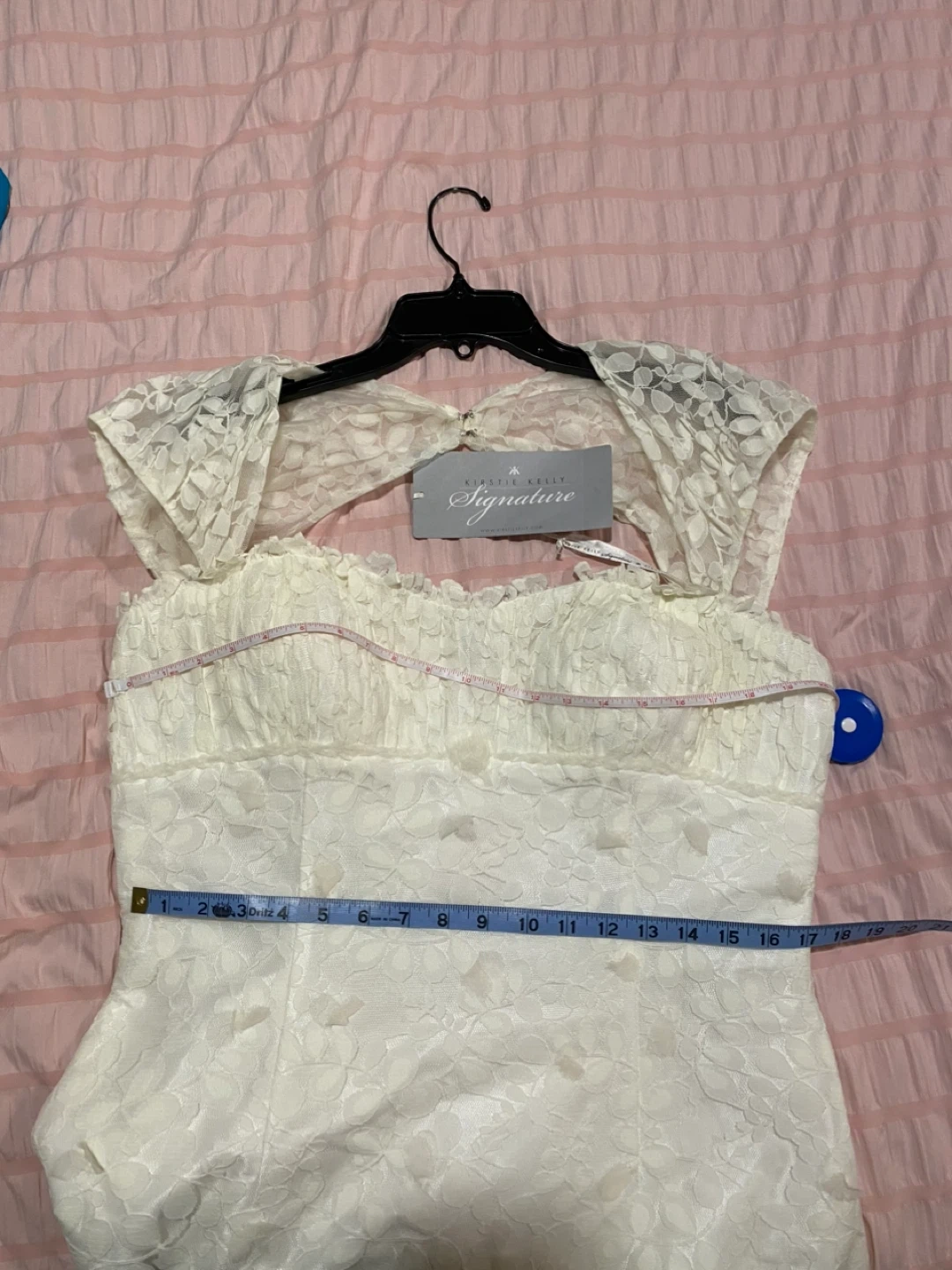 47See last picture for measurement. Selling a beautiful Melissa Sweet Signature wedding dress. It features a lovely lace design and a unique cut-out back. Perfect for your special day!