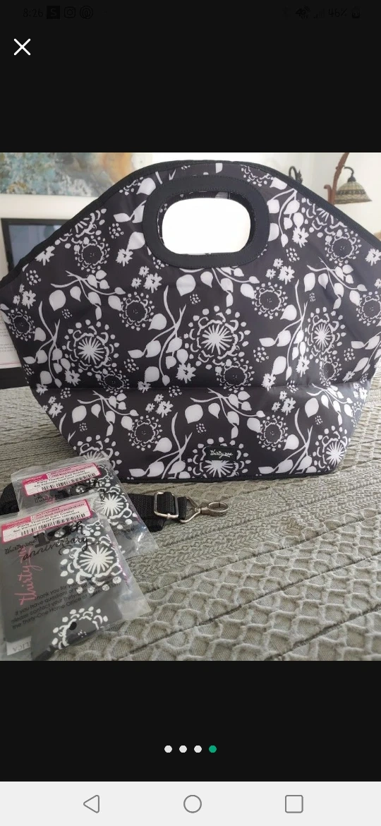 15This is a Thirty-One insulated lunch bag. It features a black and white floral pattern. It also comes with 2 can coolers & strap. NEW in bag