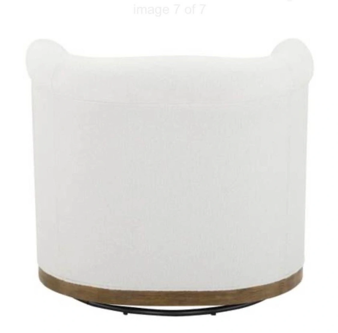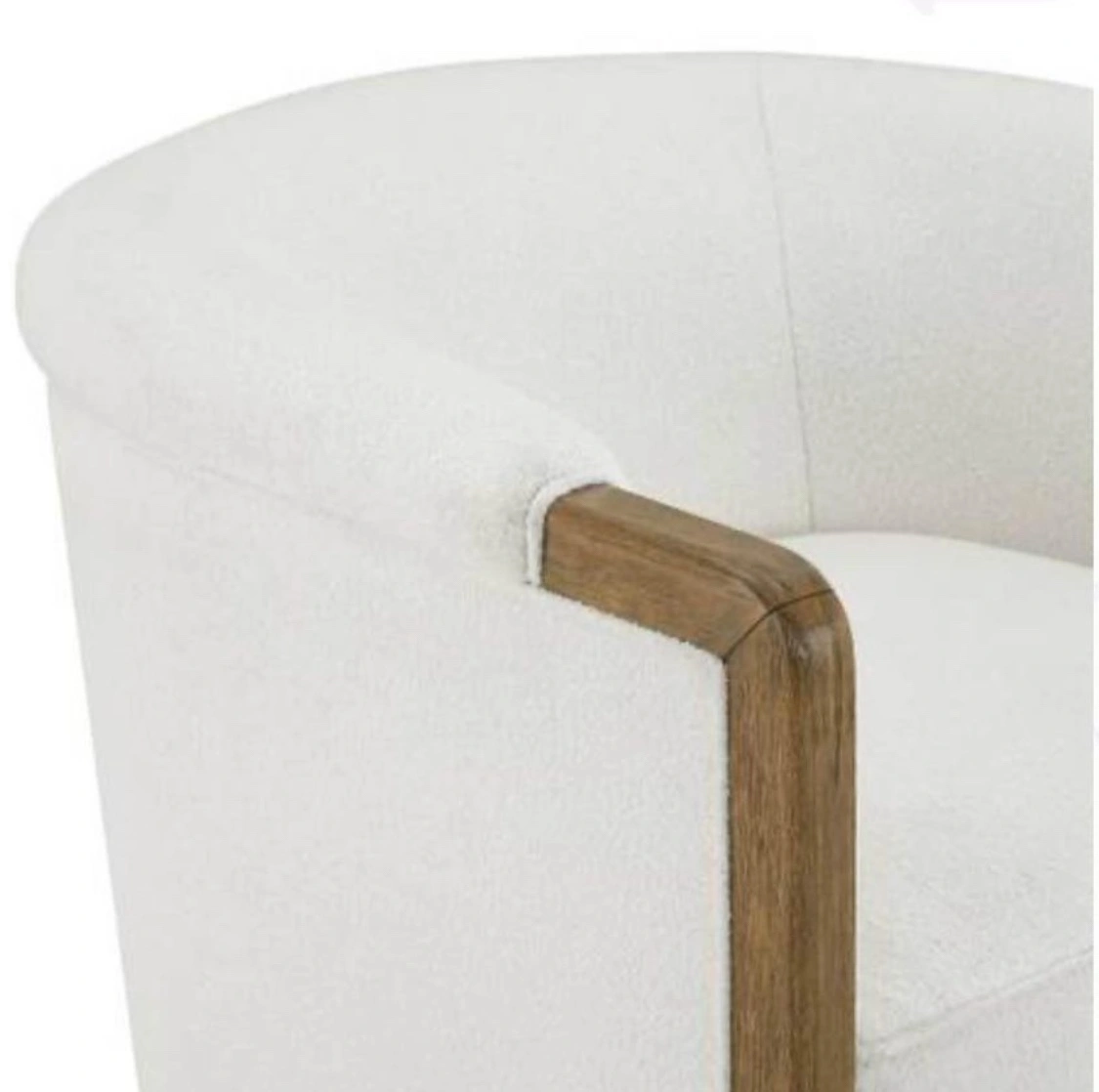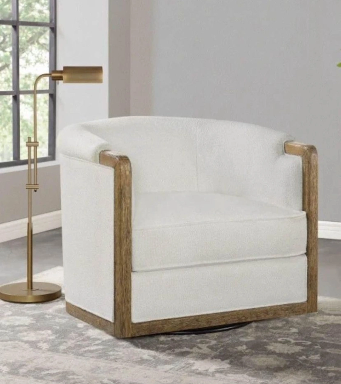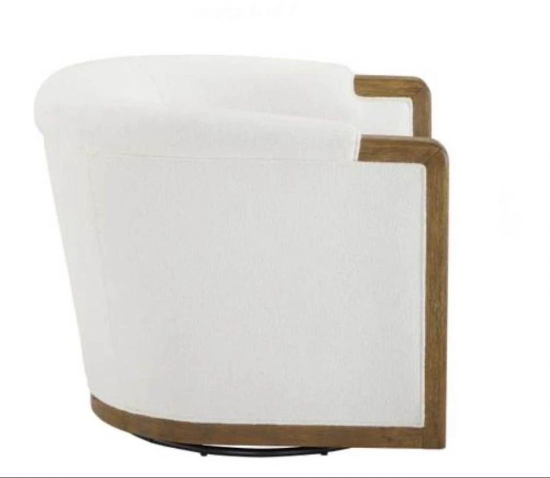 New Thomasville Fabric Swivel Chair with Wood Trim - $375 Dimensions: 31.3” L x 33” W x 28.2” H Seat Height: 18" Seat Depth: 23" Back Height: 28.2" Arm Height: 26" Thomasville Fabric Swivel Chair with Wood Trim. Detailed welting and all-wood trim with a warm brown finish. Attached seat with pocket coil constructed for long-lasting comfort. Curved barrel design for superior back support. Perfectly sized for a living room, reading nook, or home office. Soft and durable 100% polyester fabric
