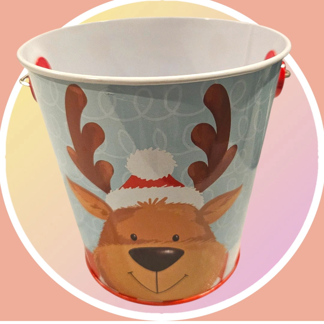 20NEW Here's a cute bucket with a Reindeer design! It's perfect for storing small items or as a decorative piece or holding candy, cookies, or as a gift container. 4x4x4.625-in. bucket also features a handle for easy carrying. They make unique goodie bags, giveaway items, candy tubs, candle holders, centerpieces, and more. You can even fill them up with crayons, colored pencils, small toys, and other items. Make your next event a smash hit with these Voila Animal Printed Tin Pails!