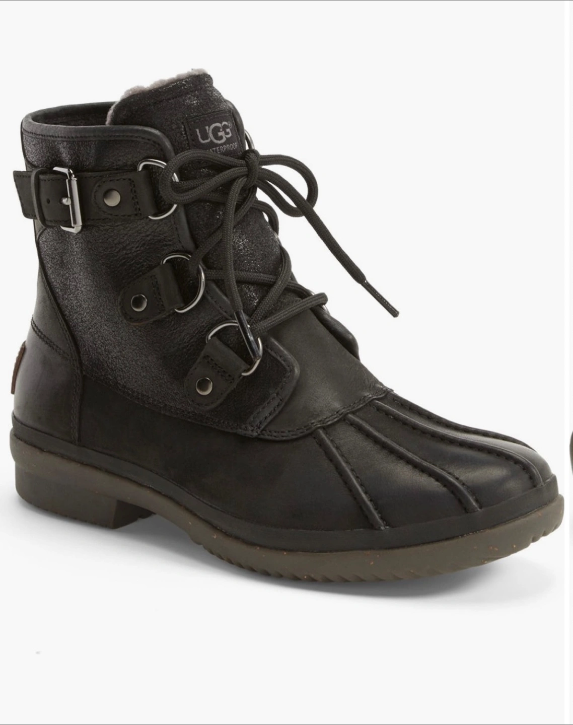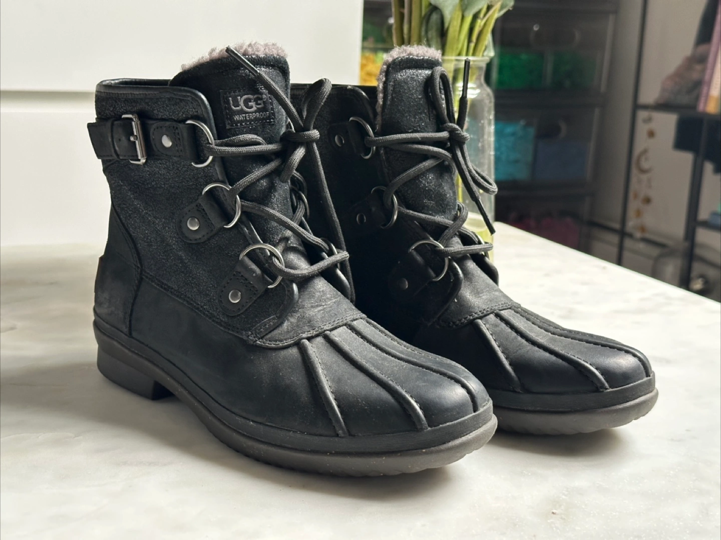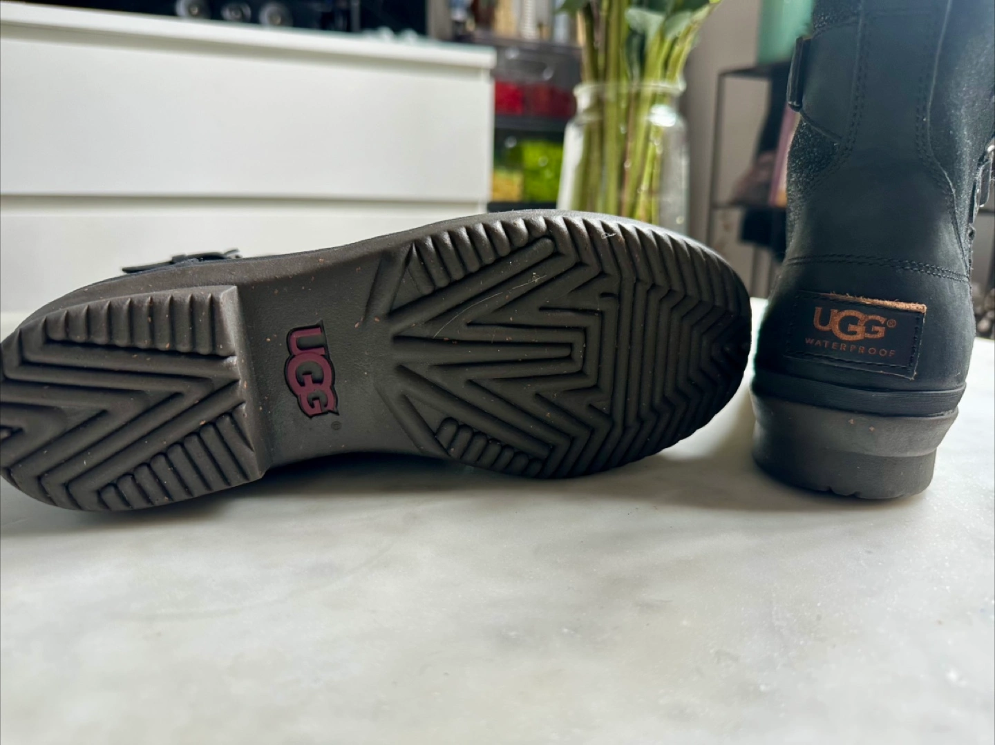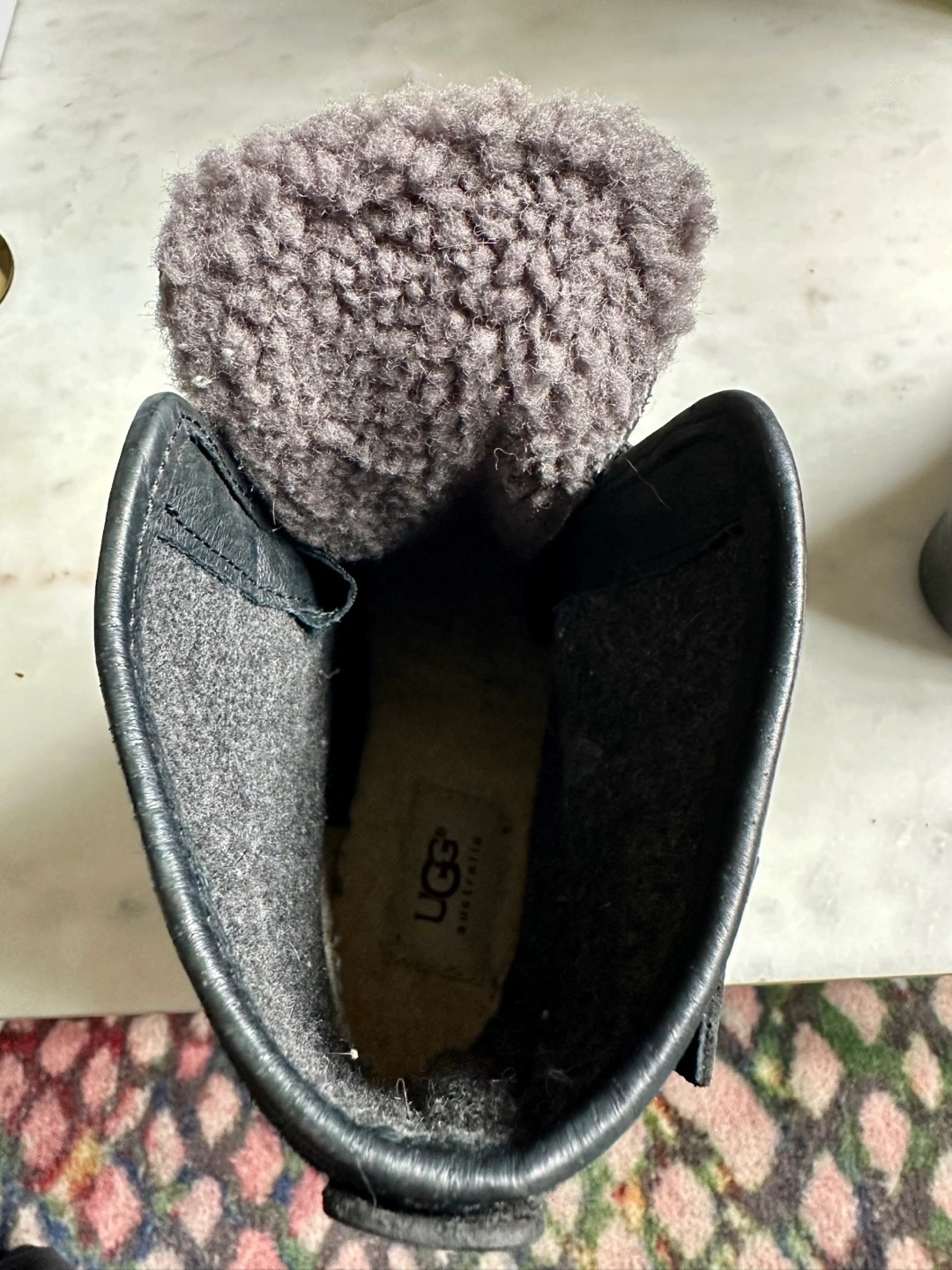 67Experience the perfect blend of style and functionality with these UGG black winter boots. Designed with a rugged ankle-high silhouette, they feature a durable rubber sole and a stylish buckle accent for added flair. Ideal for cold and rainy days, these boots ensure comfort and durability with every step. They are super comfy and true to size. I just never ended up using them and now I'm moving to Hawaii! Retail $169.95 Pickup in Greenpoint, Cash or Venmo!