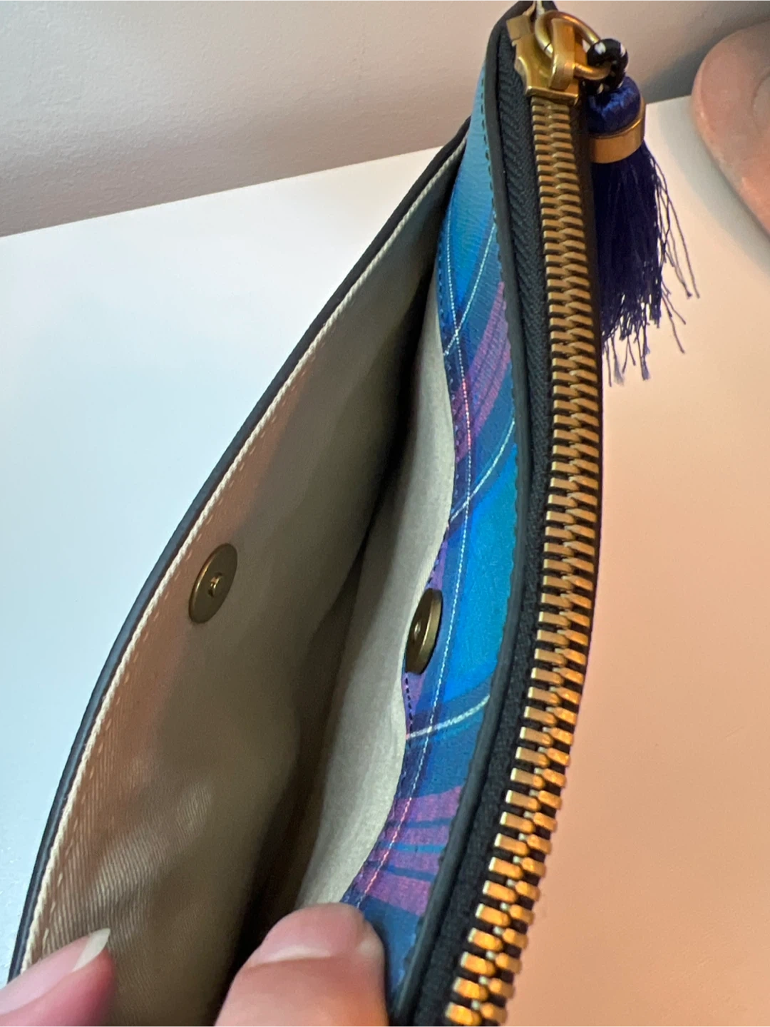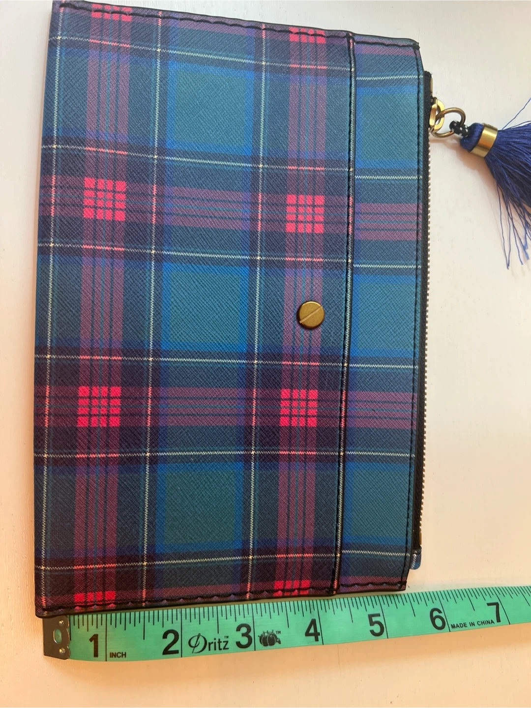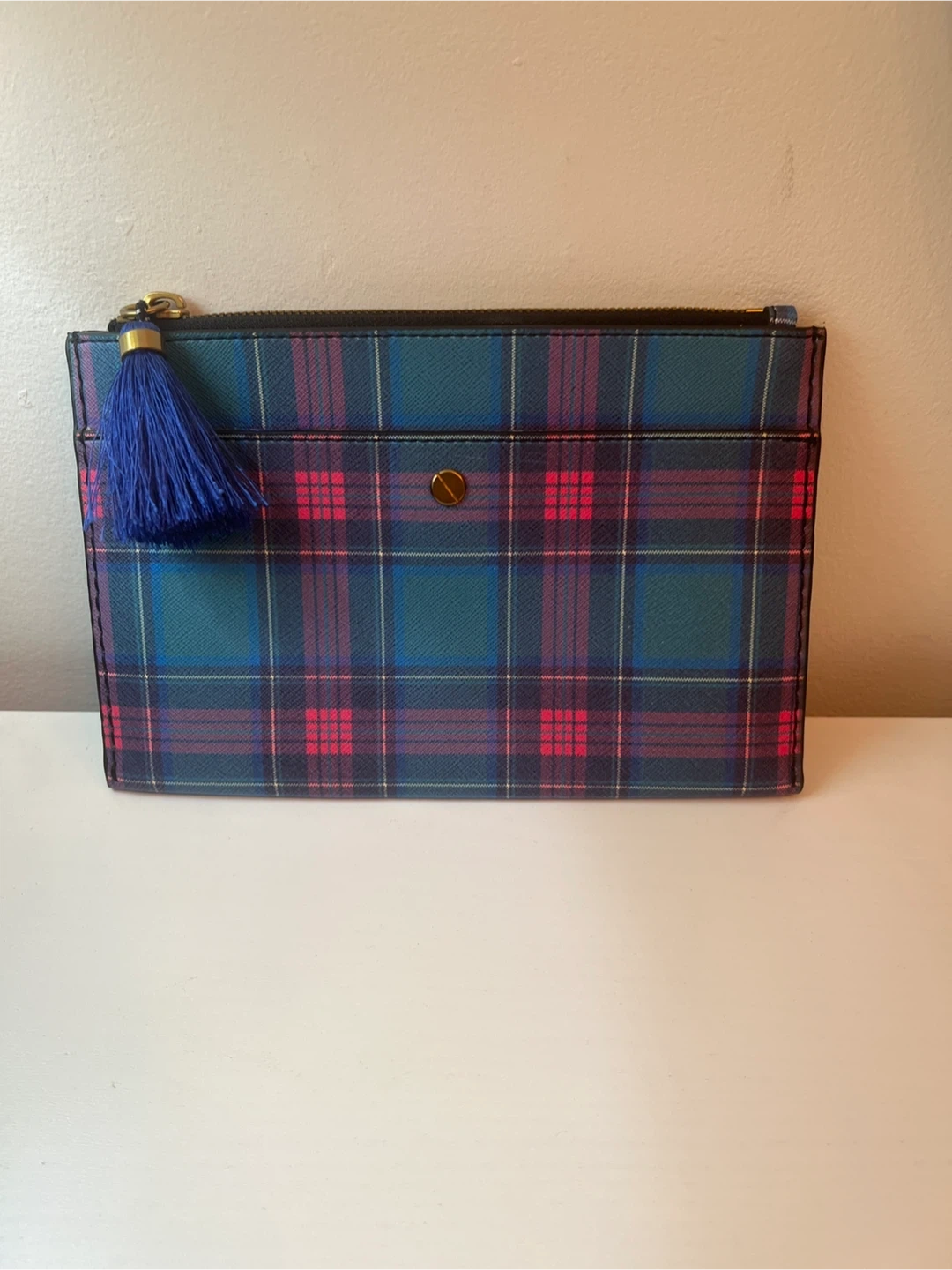 15Make an Offer ! J.Crew 100% leather pouch. vibrant plaid pattern, brass hardware and a blue tassel. See pics for approximate dimensions.