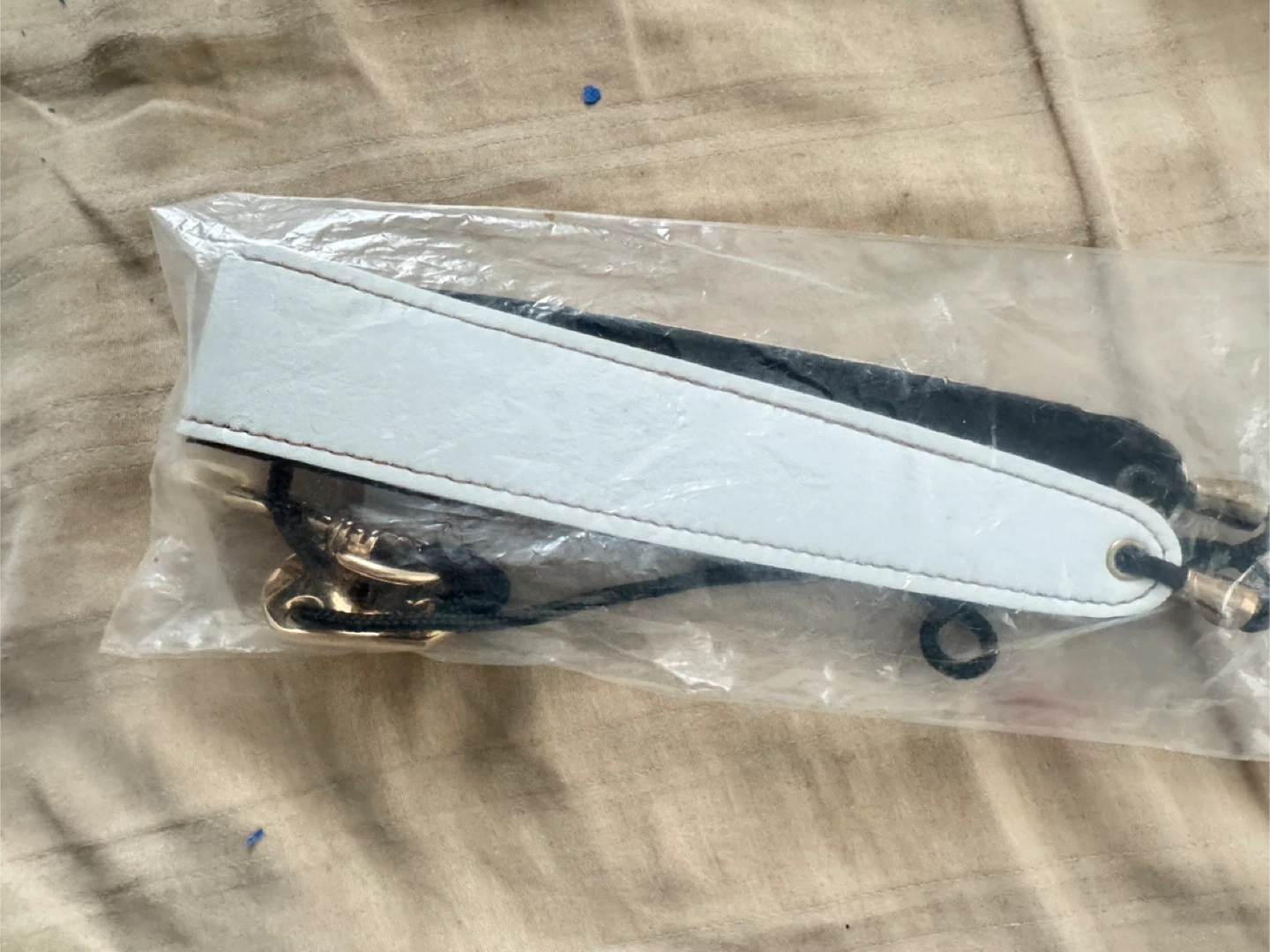134Selling a brand new saxophone neck strap! It's white leather with black trim and gold-colored hardware. Never been used and still in its original packaging