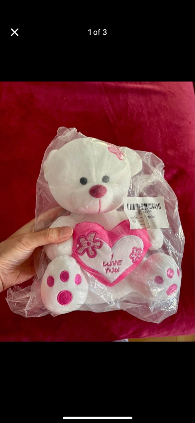49I'm selling a brand new, adorable white teddy bear! It has a sweet pink heart with 'I love you' embroidered on it. It's still in its original packaging, ready to be a cuddly friend! 2 units are available.