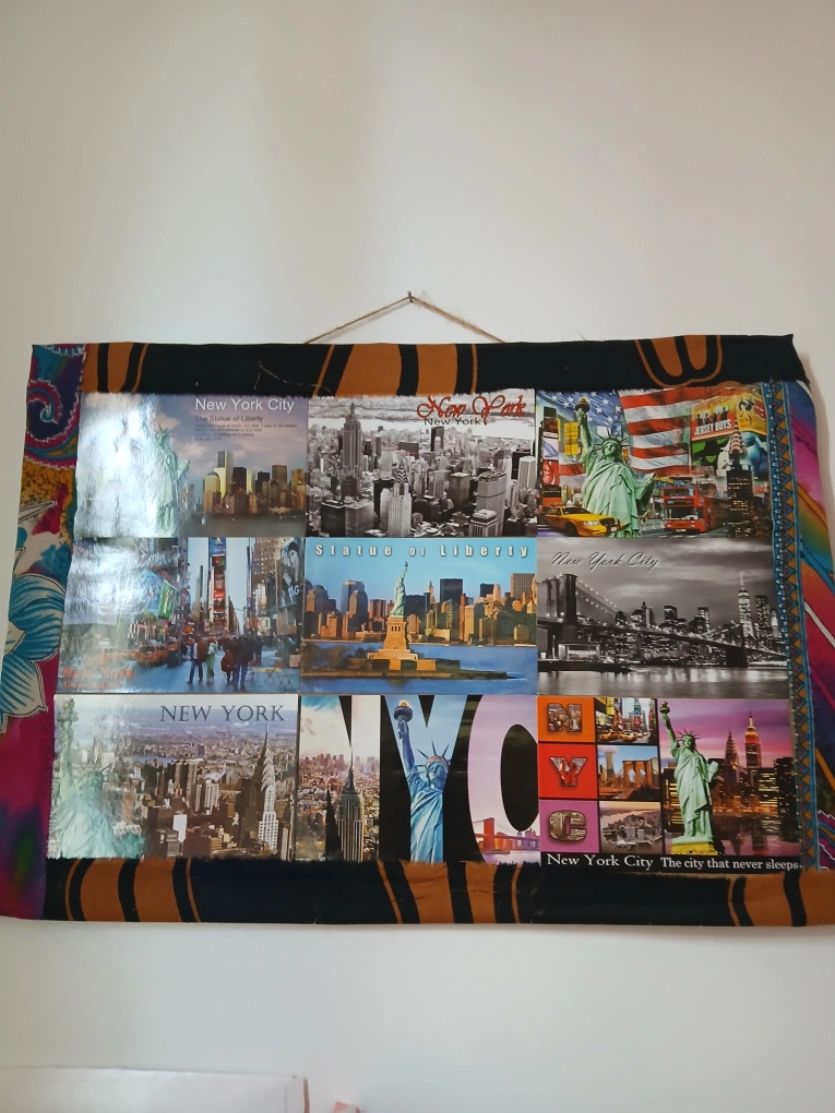 This is a unique wall hanging featuring a collage of New York City images. It showcases iconic landmarks like the Statue of Liberty and the NYC skyline. The collage is framed with a colorful border, adding a touch of vibrancy to any room