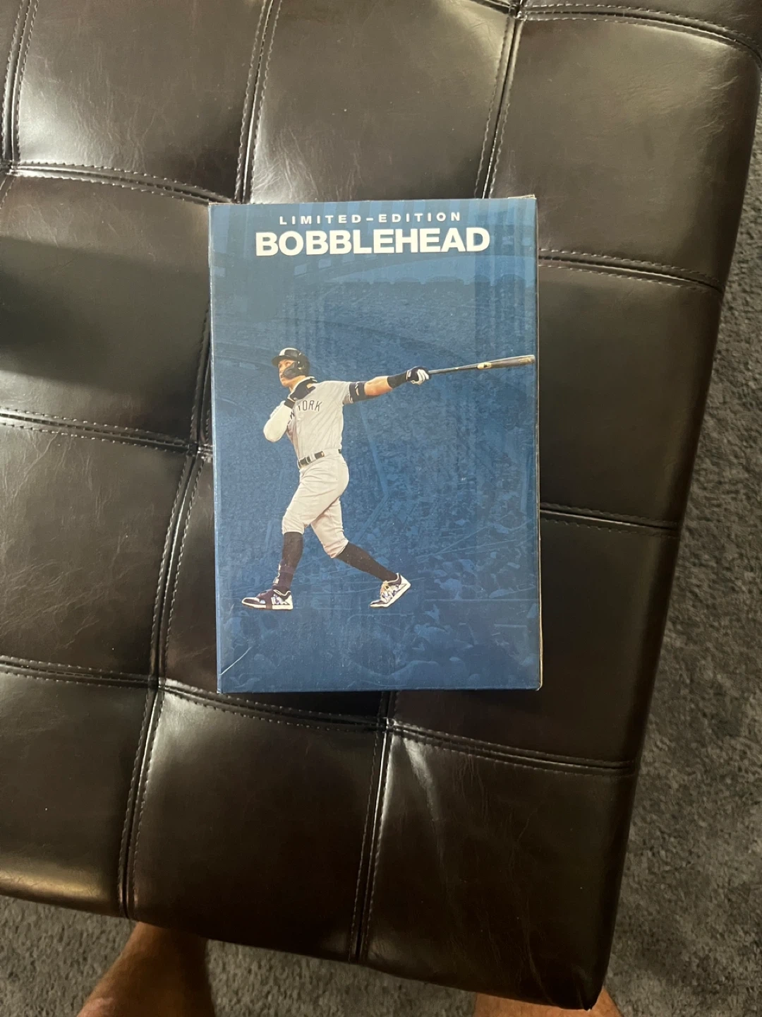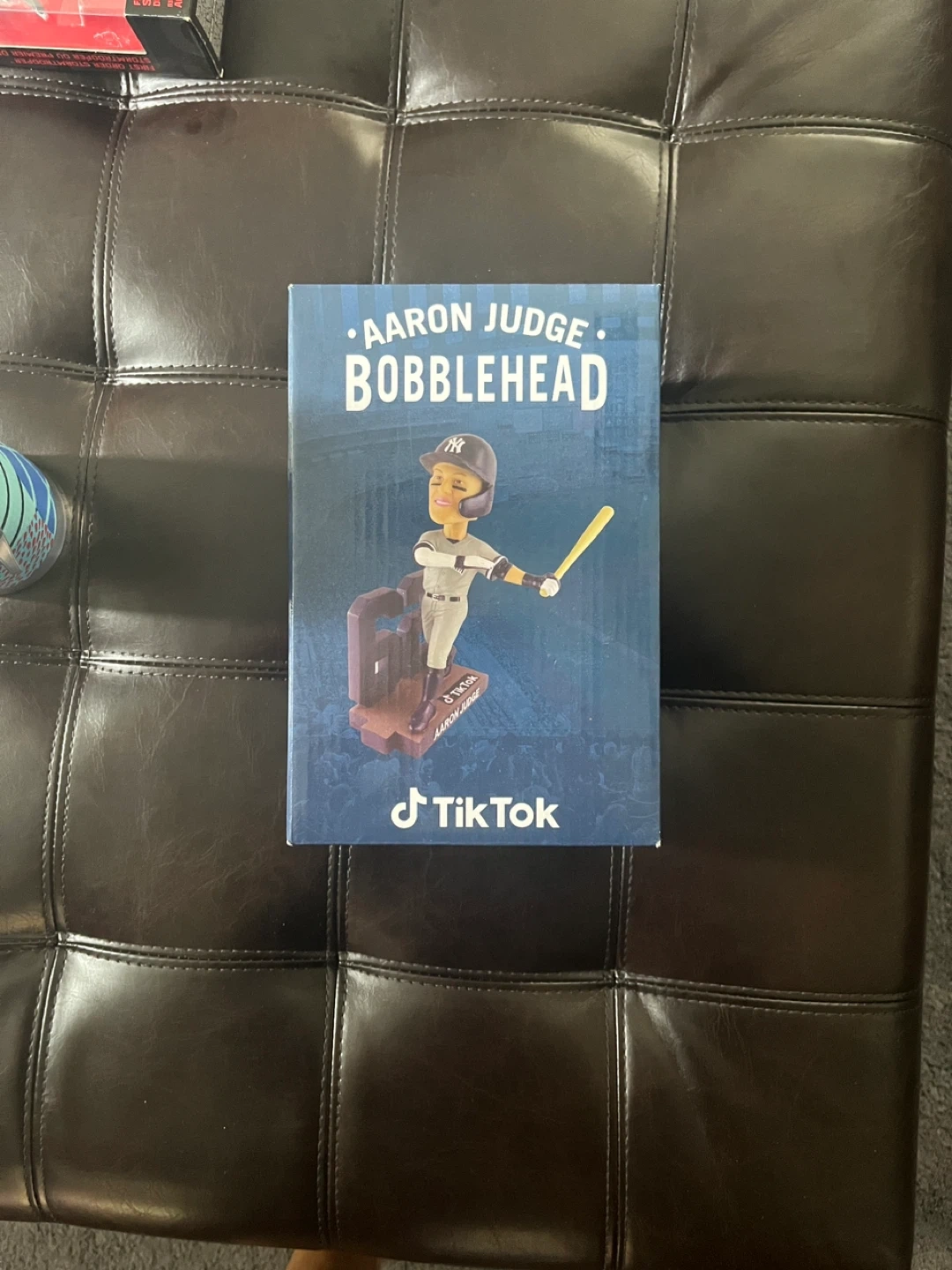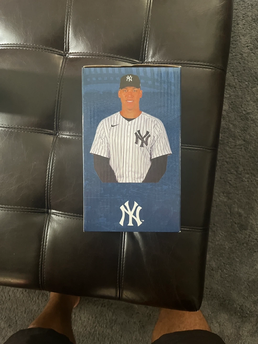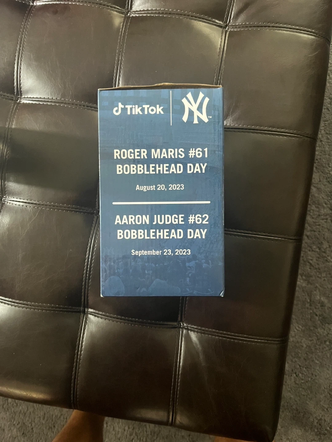 Selling a New York Yankees Aaron Judge Bobblehead. It commemorates Aaron Judge #62 Bobblehead Day on September 23, 2023. The box also mentions Roger Maris #61 Bobblehead Day on August 20, 2023. Great for any Yankees fan!