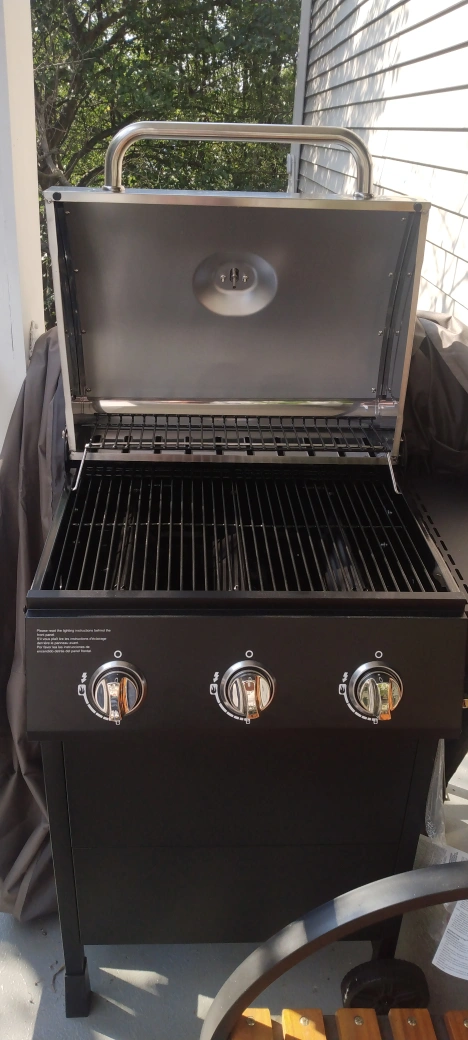 The grill is stainless steel with a black base and a side shelf. It appears to have three control knobs and a temperature gauge. It includes a cover. Consider using it to cook delicious meals on beautiful days. H 43.19 X W 46.54 X 22.68 inches and 43 lbs.
