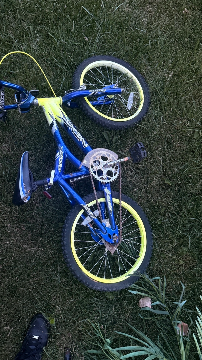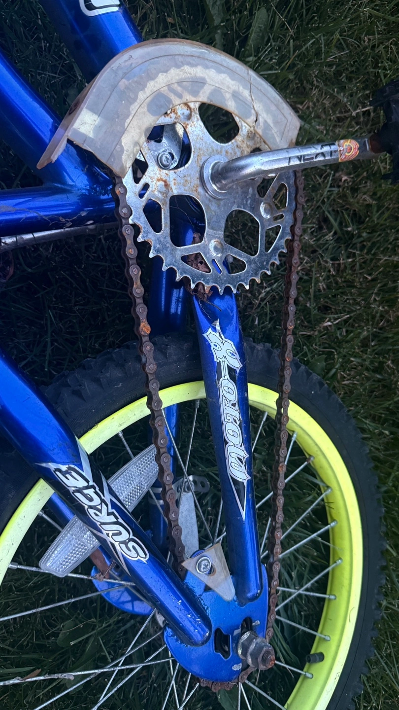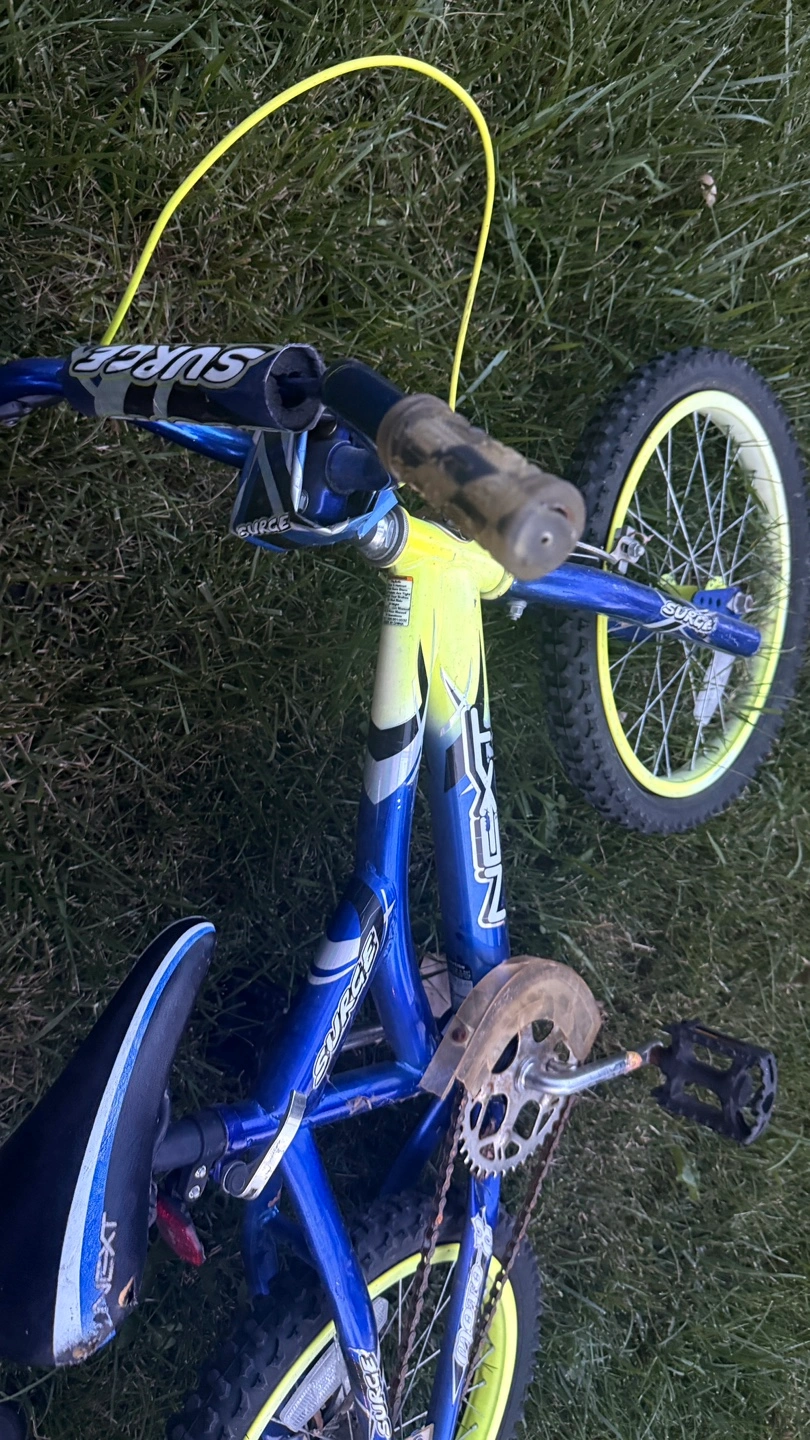 Selling a Next Surge kids bike in blue and yellow. It shows signs of use but needs some fixes. Trying tog est rid of it.