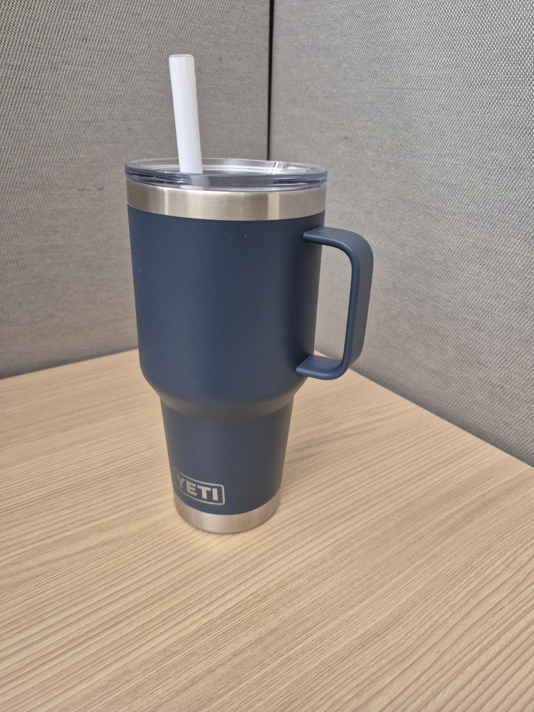 Dark blue YETI Rambler 30 oz tumbler. Stainless steel and durable. Includes lid and straw. Great for hot or cold drinks.