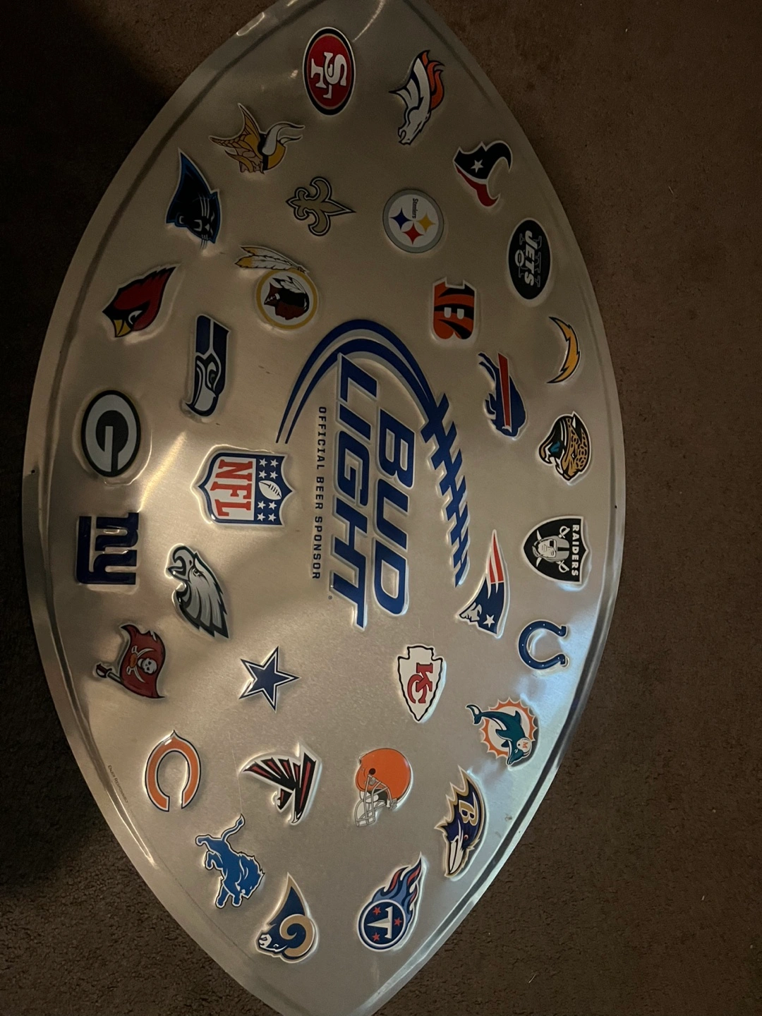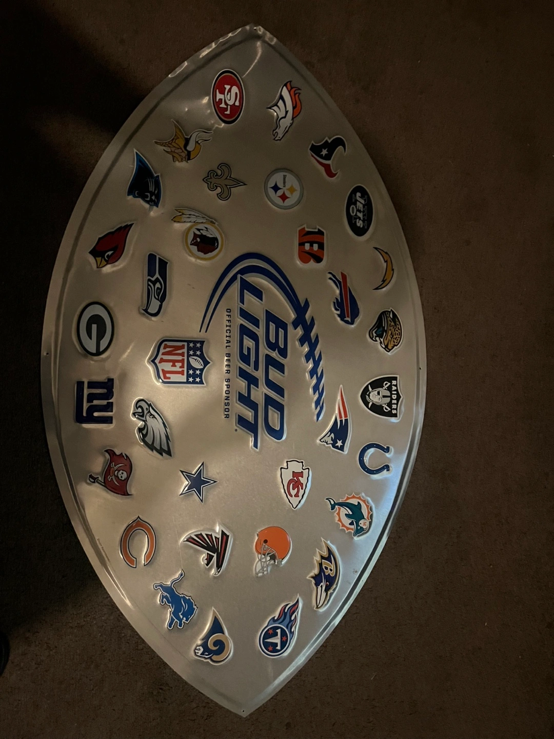 Metal sign shaped like a football. Features all NFL team logos and Bud Light branding. Great for man cave or game room.
