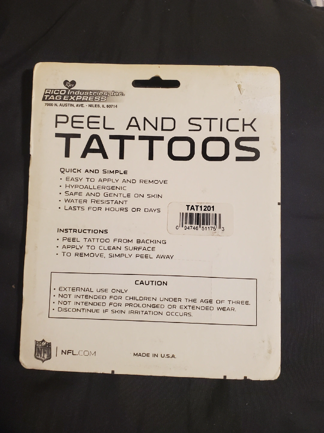 Selling NFL Chicago Bears peel and stick tattoos! These are easy to apply and remove, hypoallergenic, and water resistant. They're safe and gentle on skin and last for hours or days. Perfect for showing your team spirit!