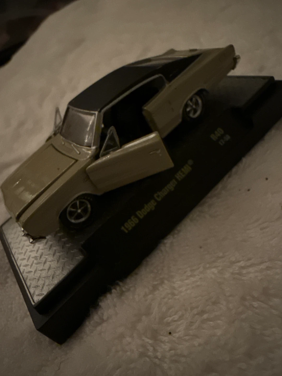 This is a 1:43 scale diecast model of a 1966 Dodge Charger R/T. The model features opening doors and comes displayed on a black base. It's a detailed replica for car enthusiasts.
