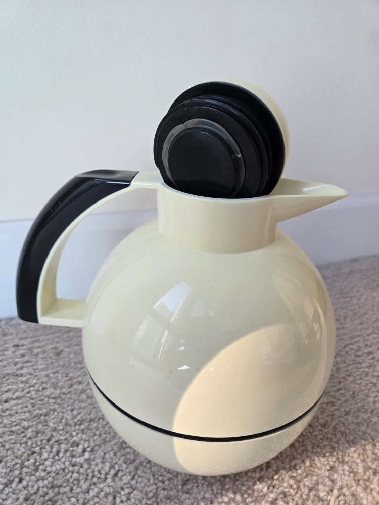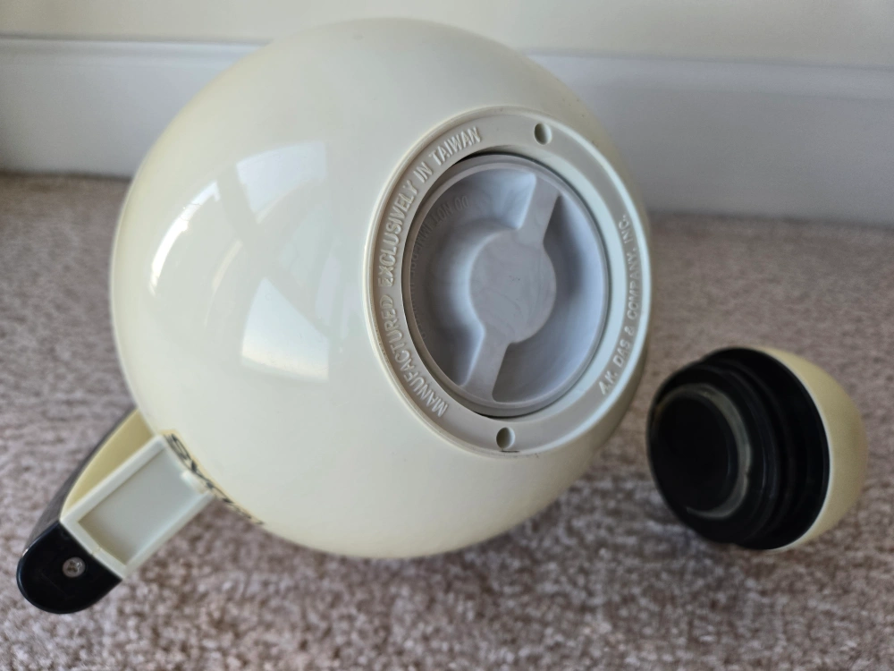 Thermos carafe with black handle and lid. White with black trim. Made in Taiwan.