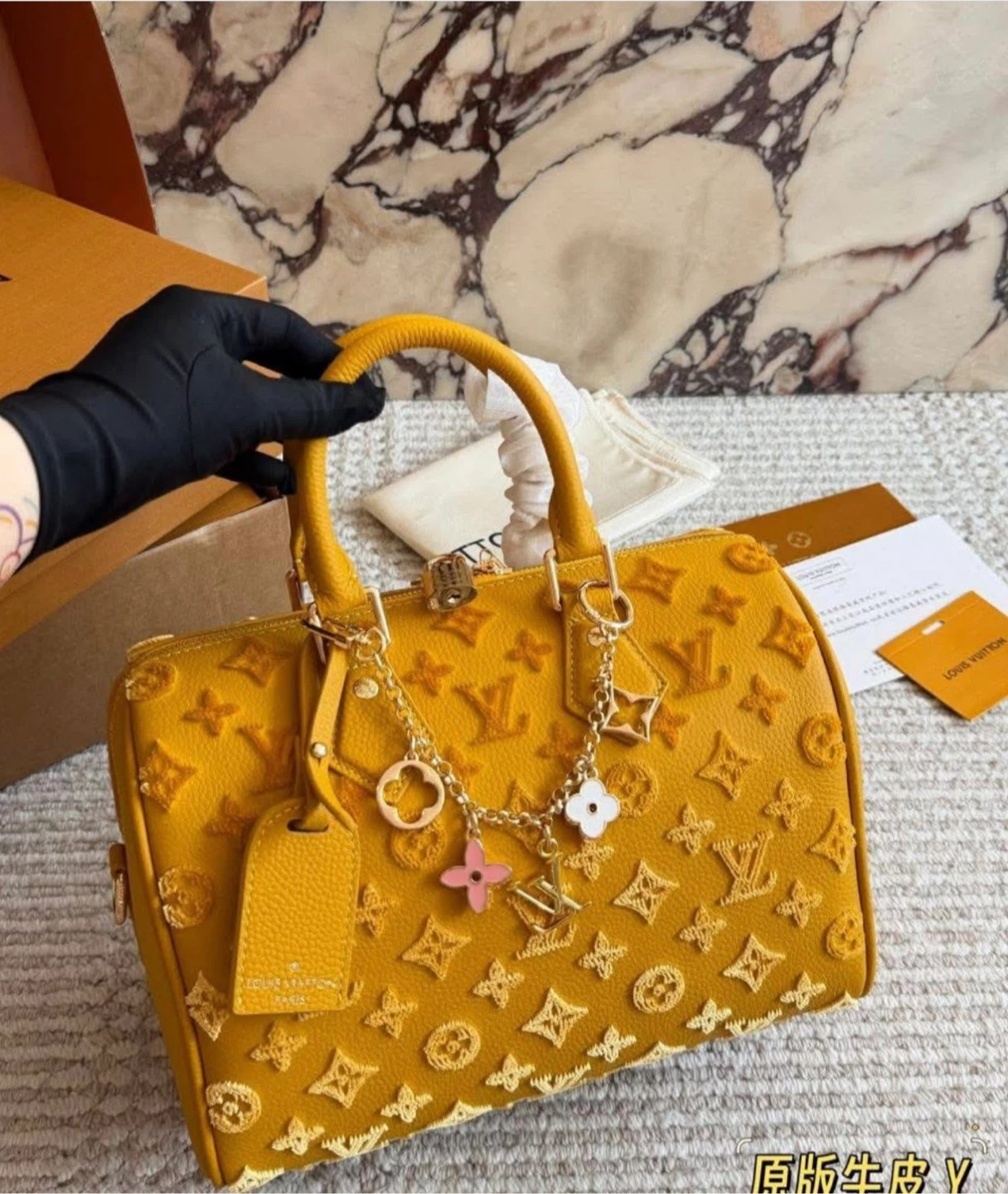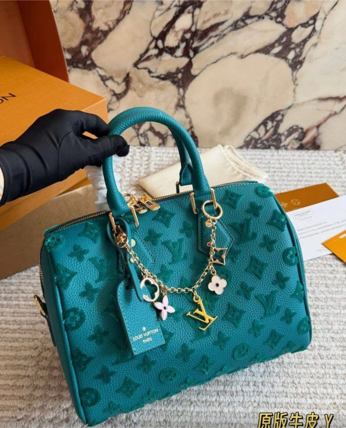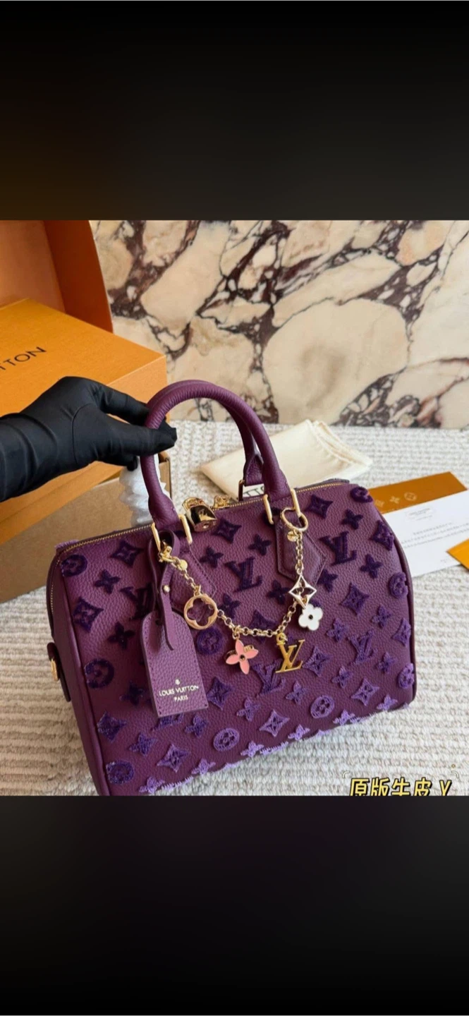 This is a Louis Vuitton Speedy bag. It comes with decorative charms.